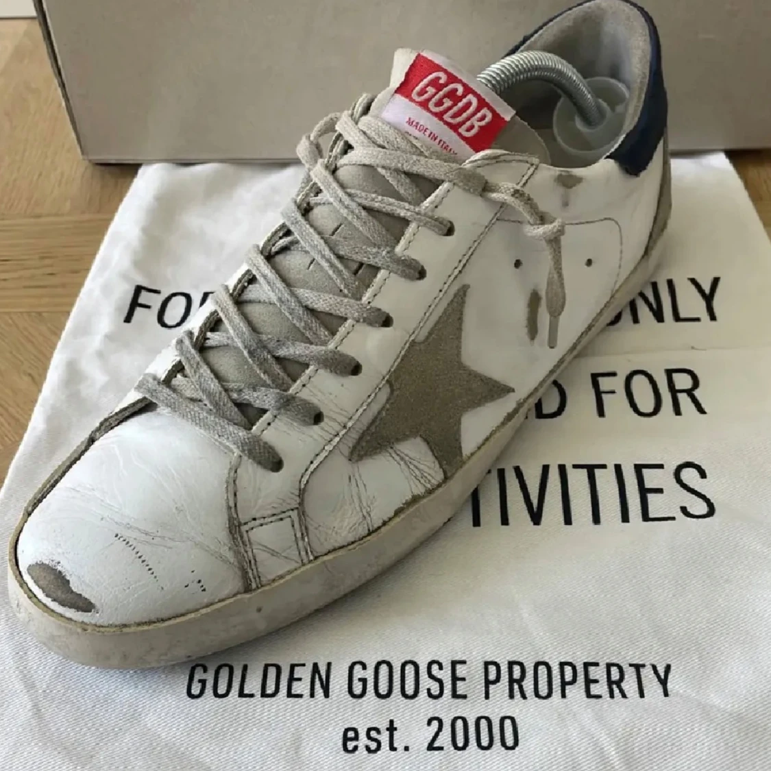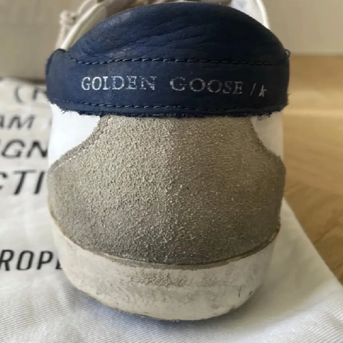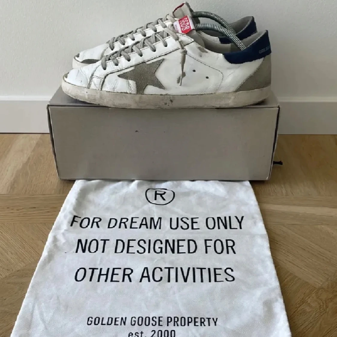 Golden Goose Superstar sneakers i vitt skinn med grå mockadetaljer och blå häl. Klassisk stjärna på sidan, snörning och platt sula. Snyggt slitna för en cool streetstyle-look. Perfekta för dig som gillar exklusiva och trendiga sneakers.