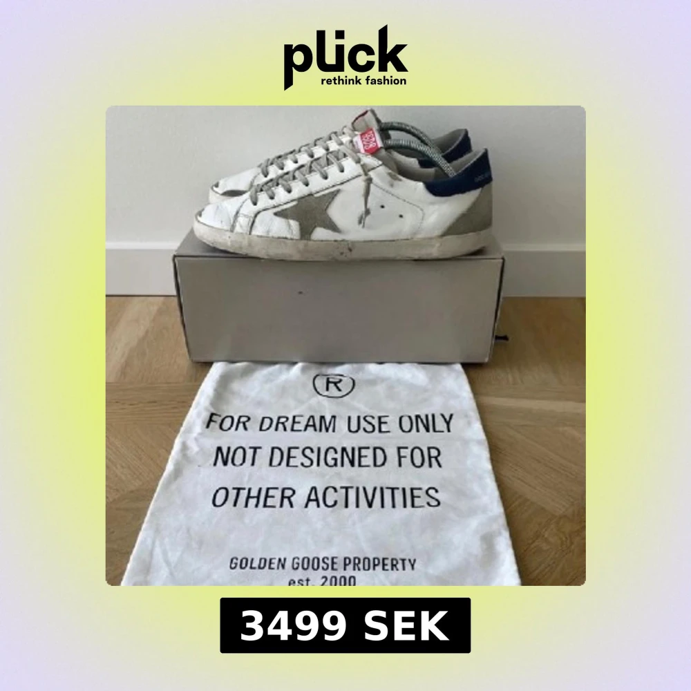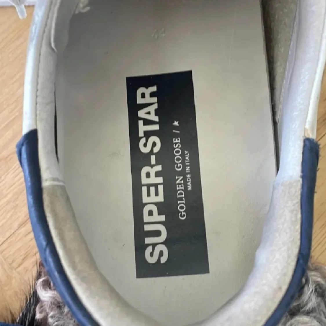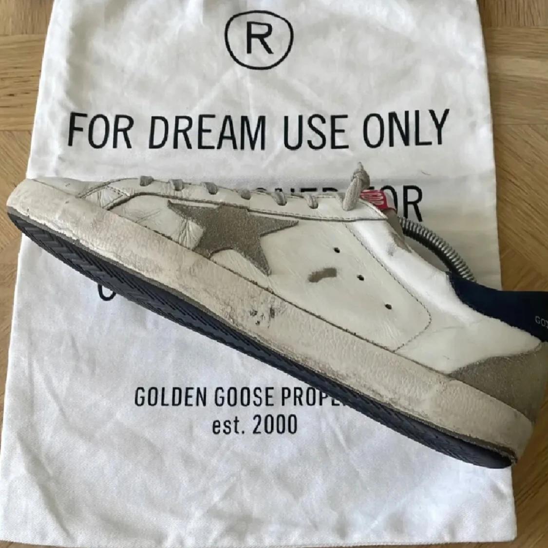 Golden Goose Superstar sneakers i vitt skinn med grå mockadetaljer och blå häl. Klassisk stjärna på sidan, snörning och platt sula. Snyggt slitna för en cool streetstyle-look. Perfekta för dig som gillar exklusiva och trendiga sneakers.