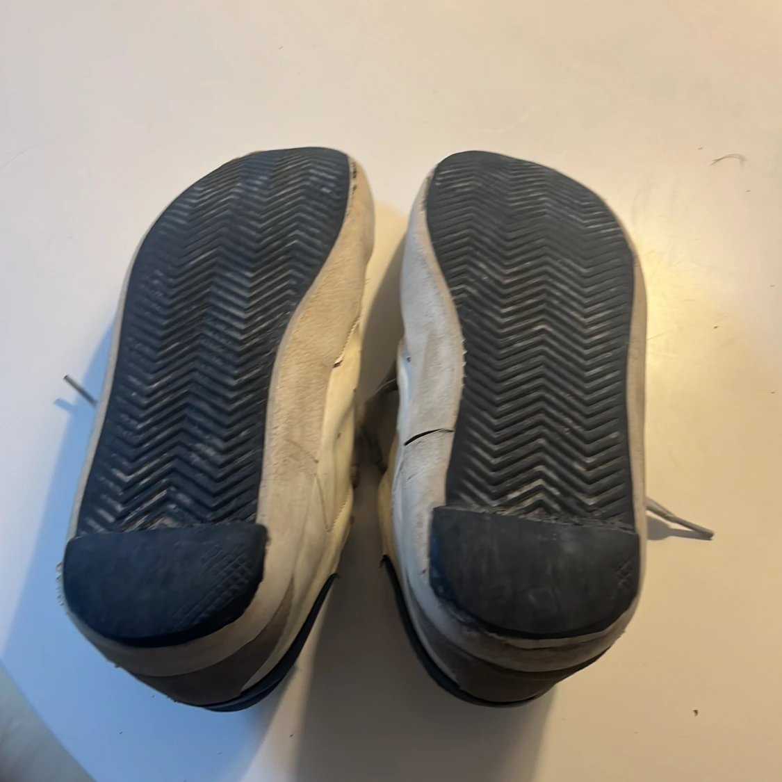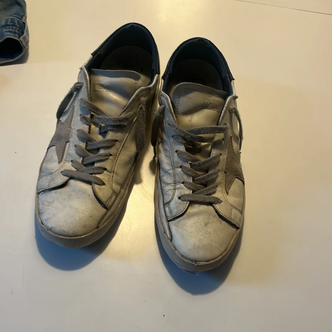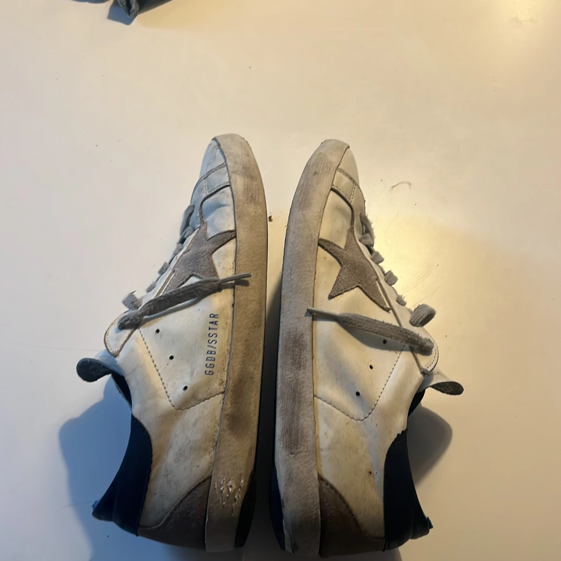 Golden Goose Superstar sneakers i vitt skinn med grå mockadetaljer och stjärna på sidan. Skorna har grå snörning, blå hälkappa och GGDB/SSTAR-tryck på sidan. Klassisk platt sula och rund tå. Perfekt för dig som gillar en avslappnad och trendig look. Säljer billigt då det är väldigt slitna kan tänka mig gå ner i pris vid övriga frågor är bara att höra av sig