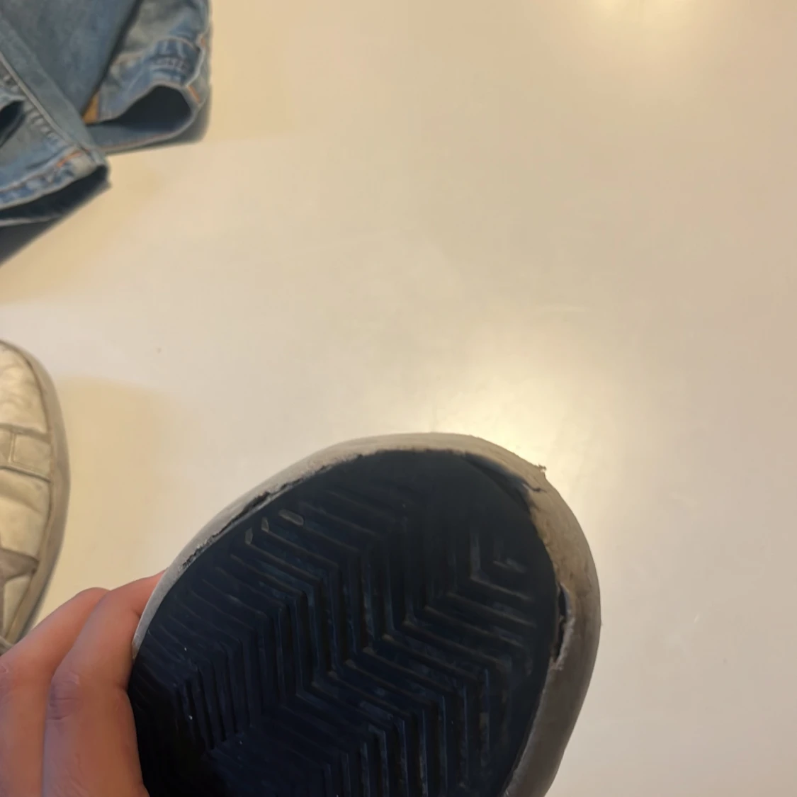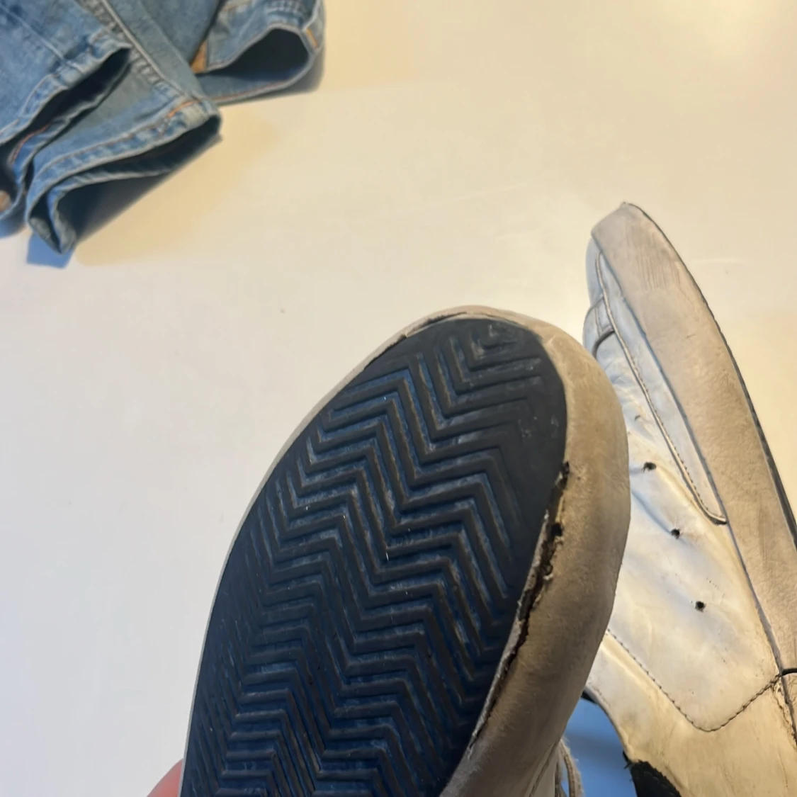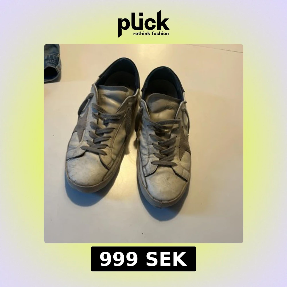 Golden Goose Superstar sneakers i vitt skinn med grå mockadetaljer och stjärna på sidan. Skorna har grå snörning, blå hälkappa och GGDB/SSTAR-tryck på sidan. Klassisk platt sula och rund tå. Perfekt för dig som gillar en avslappnad och trendig look. Säljer billigt då det är väldigt slitna kan tänka mig gå ner i pris vid övriga frågor är bara att höra av sig