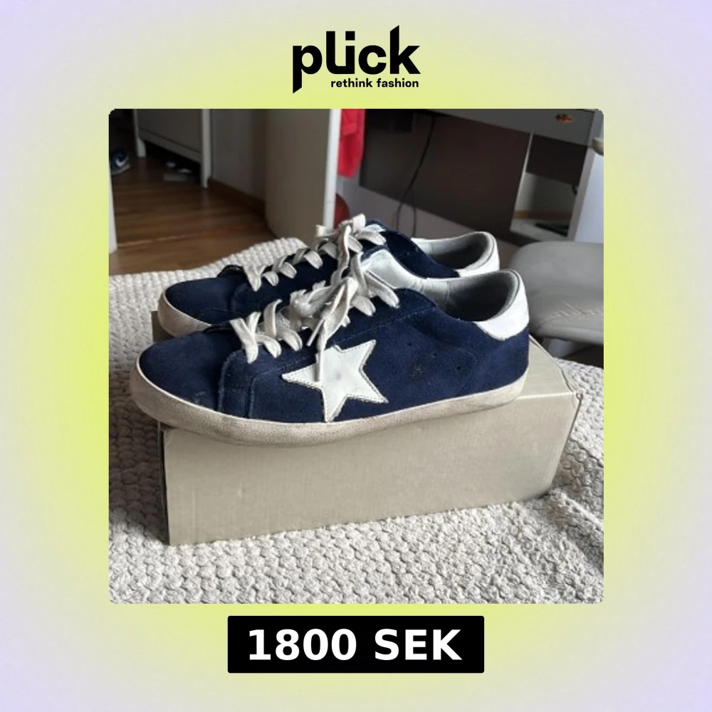 Snygga mörkblå sneakers från Golden Goose med vit stjärndetalj på sidan, vita snören och vit häl. Ovandelen är i mocka och skon har en klassisk platt sula. Perfekta för dig som gillar en cool och avslappnad stil.