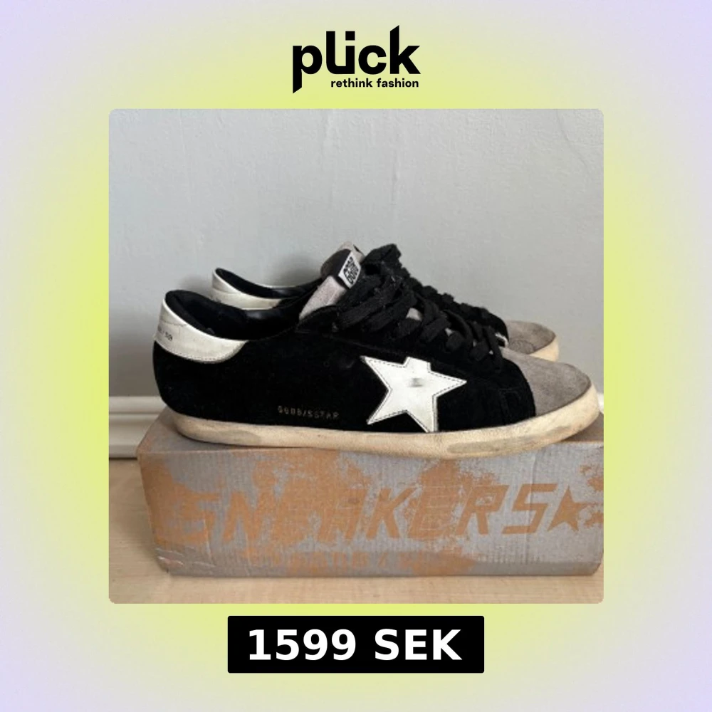 Tjena säljer nu mina golden goose som jag inte använder, passar 44-45. Skicket är 7/10 där sulan lossnat på ena skon vilket är vanligt på golden goose! (Box och skor ingår)