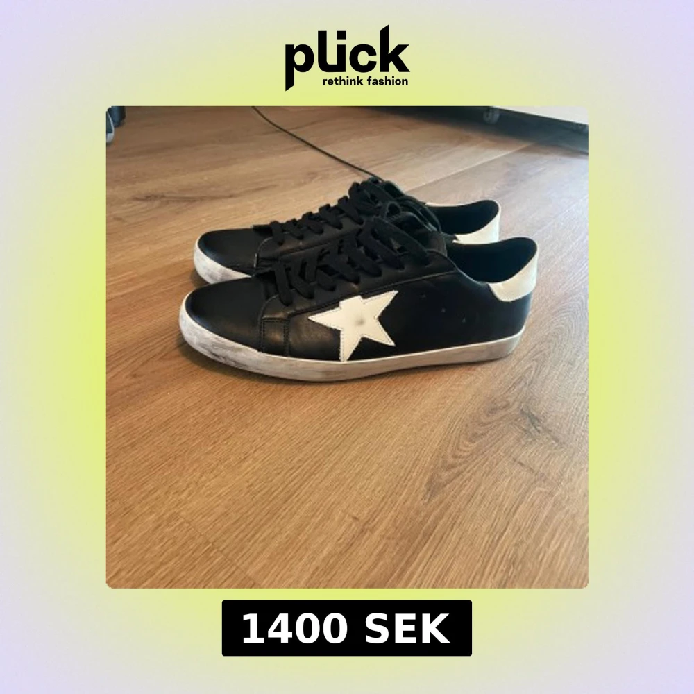 Svarta Golden Goose Super-Star sneakers i skinn med vit stjärndetalj på sidan och vit hälkappa med logga. Klassisk rund tå, svarta skosnören och vit sula med lätt sliten look. Perfekta för dig som gillar streetstyle och vill sticka ut med en ikonisk sneaker. Vet ej om skorna är äkta eller inte men är fortfarande i riktigt bra kvalité.