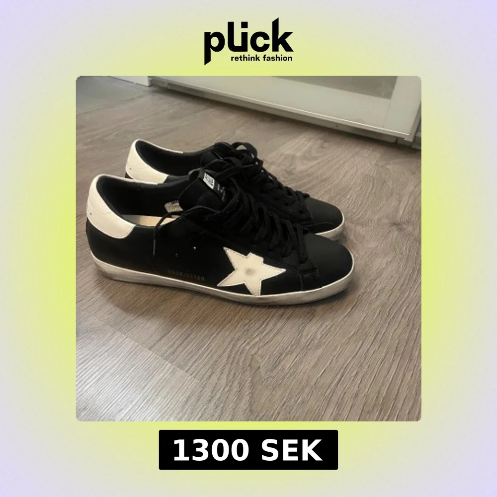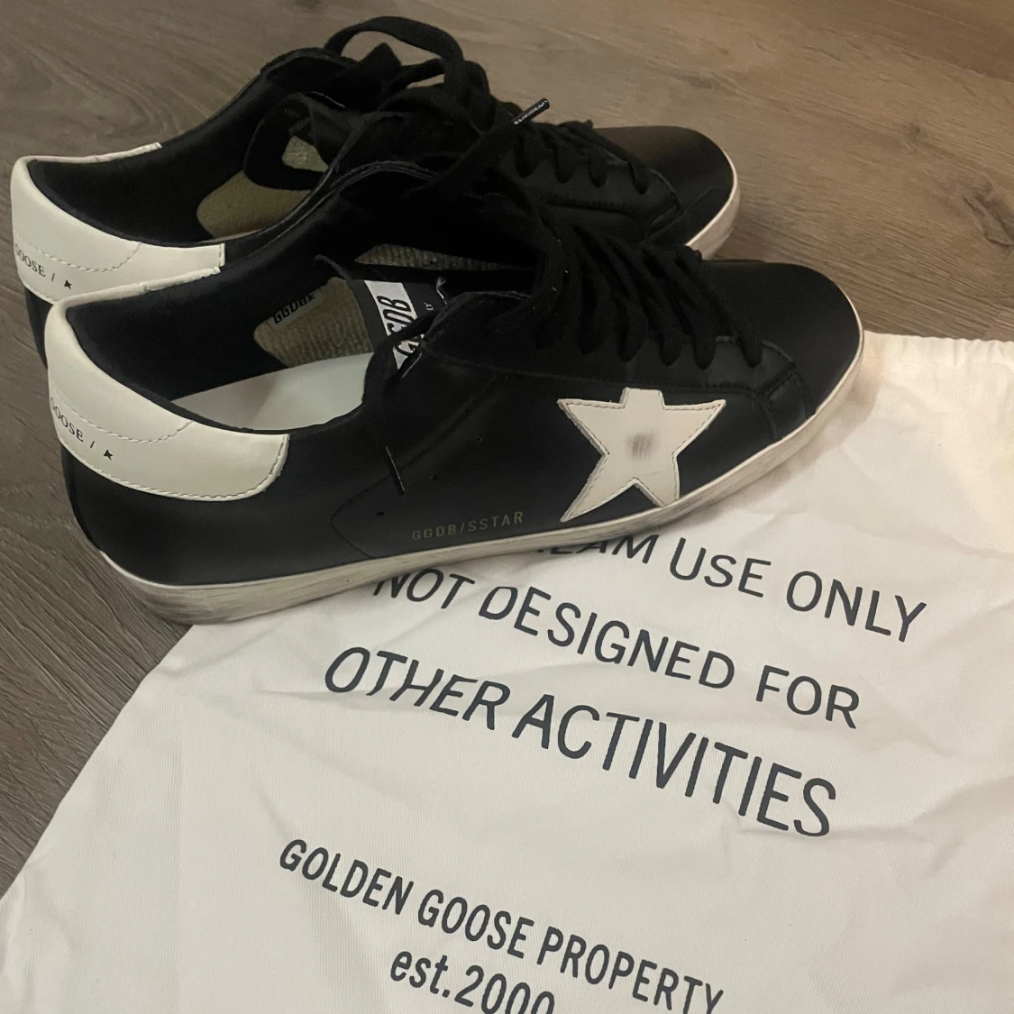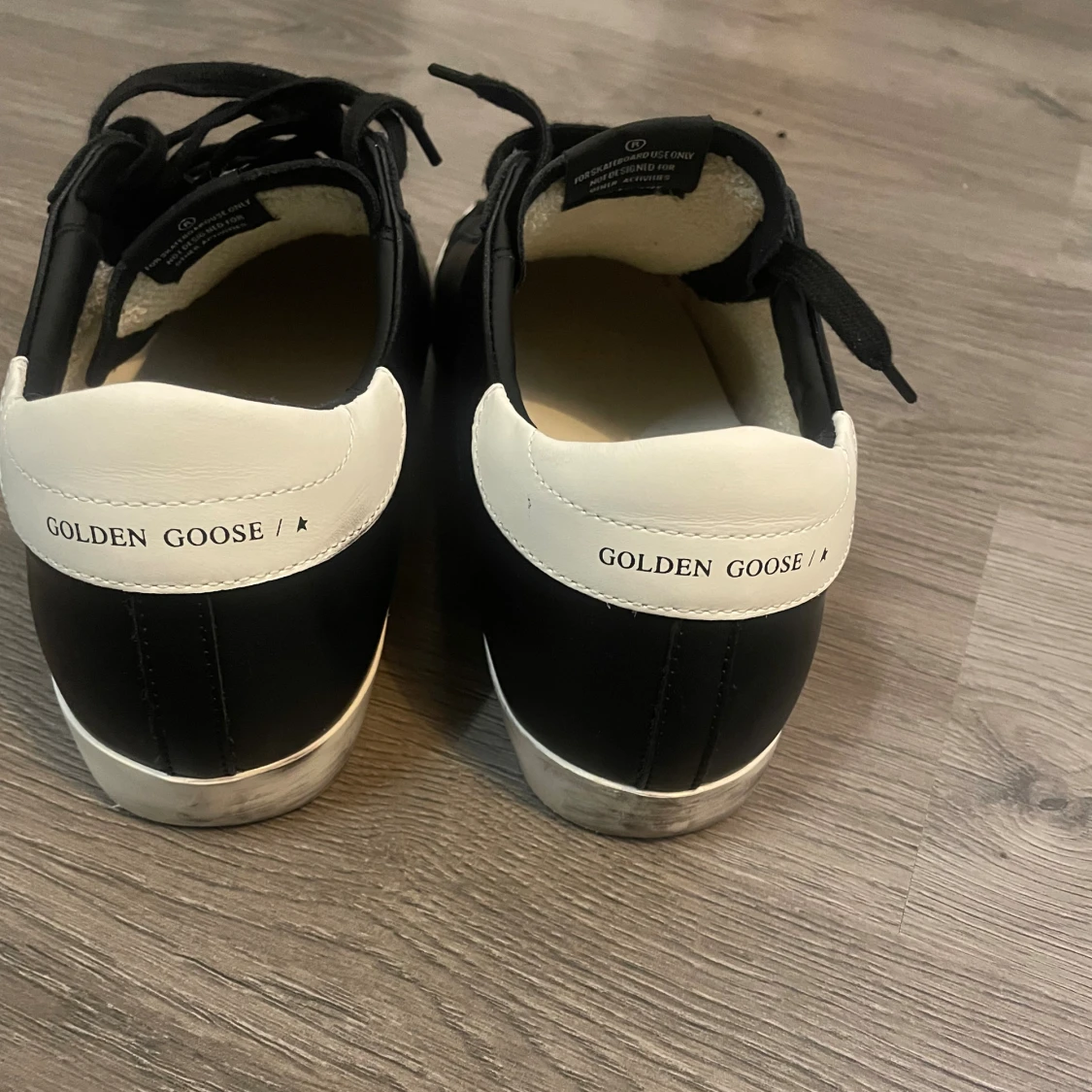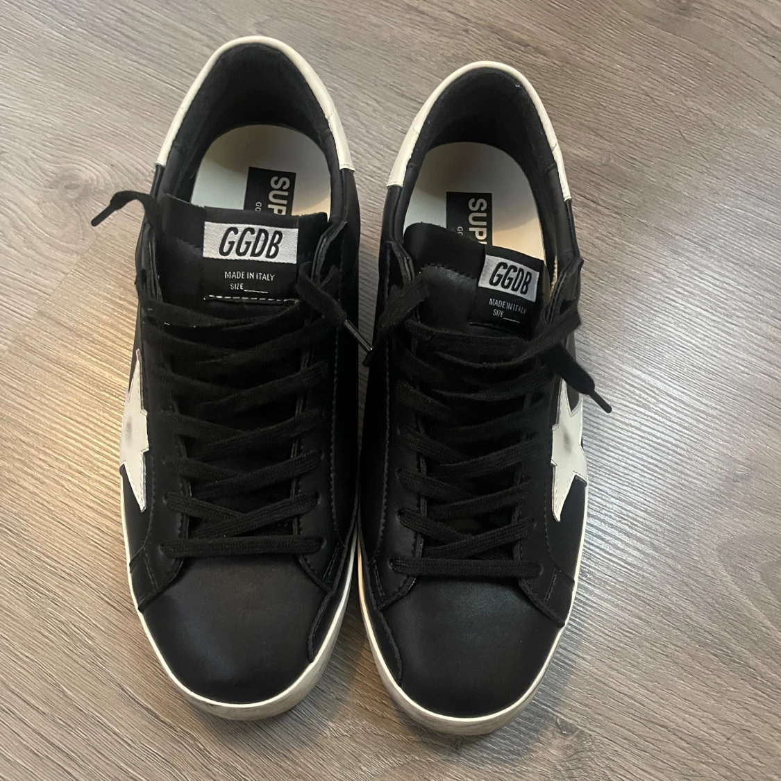 Golden Goose sneakers i svart skinn med vit häl och ikonisk vit stjärna på sidan. Dom är storlek 46 och helt oanvända.