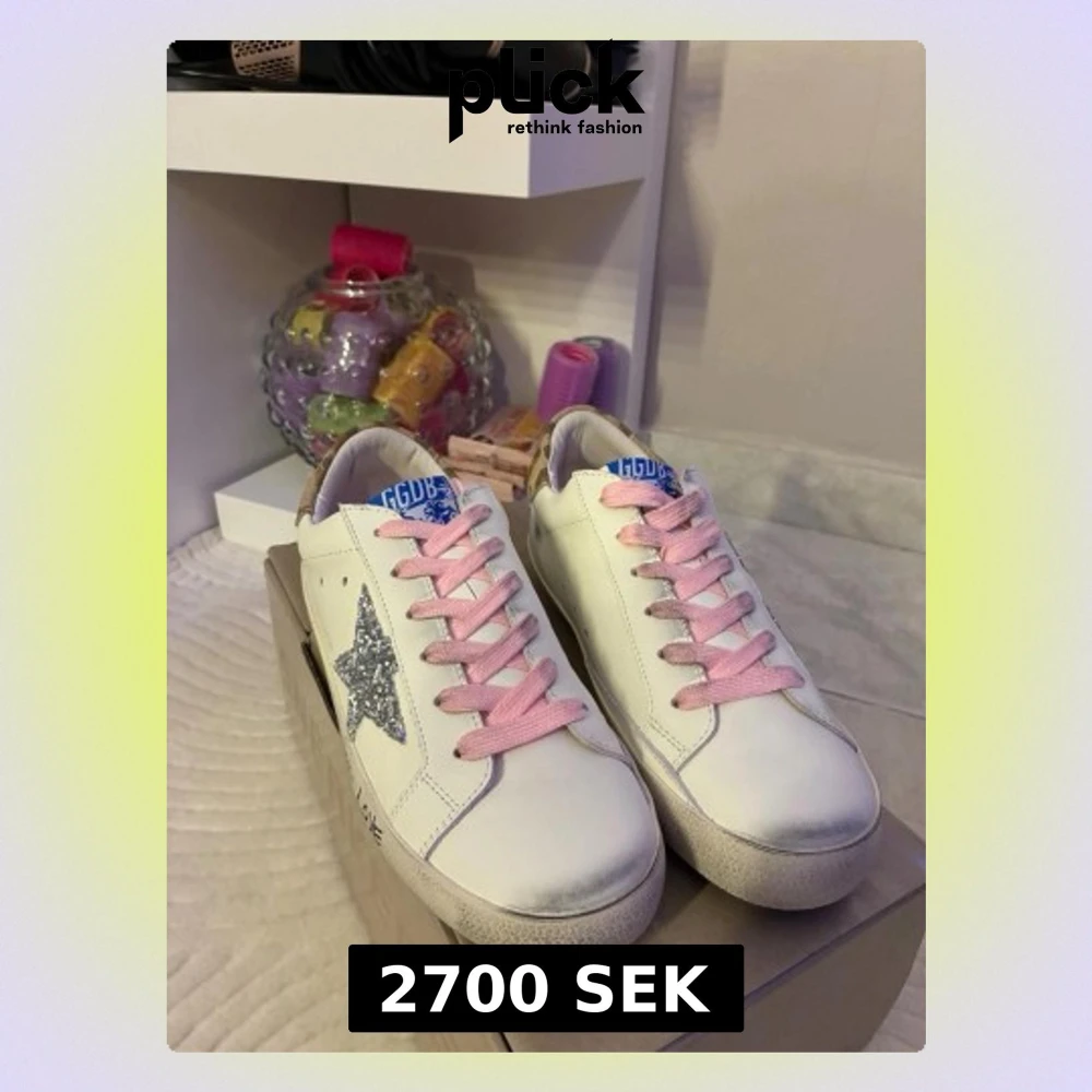 Snygga vita sneakers från Golden Goose med rosa snören, silverglittrig stjärna på sidan och blå logga på plösen. Skorna har handskriven text på sulan och beige detalj vid hälen. Perfekta för dig som vill sticka ut med coola detaljer.