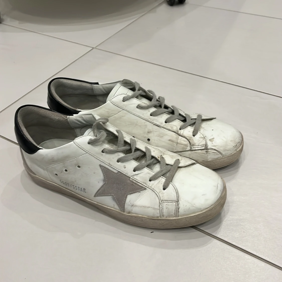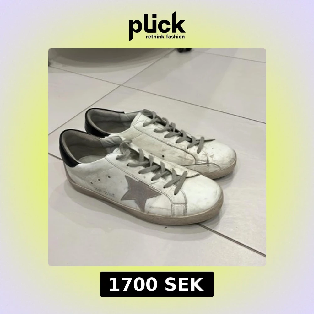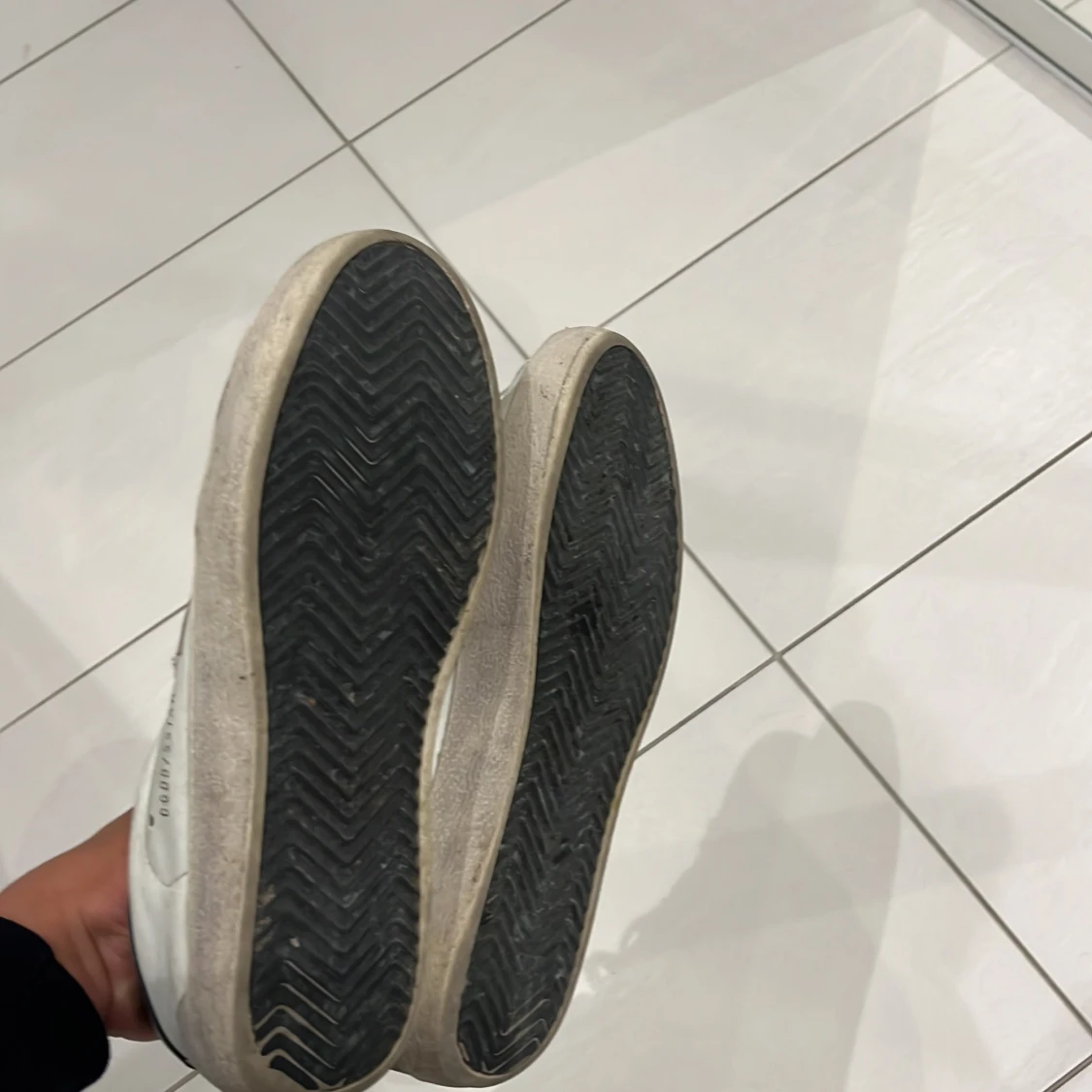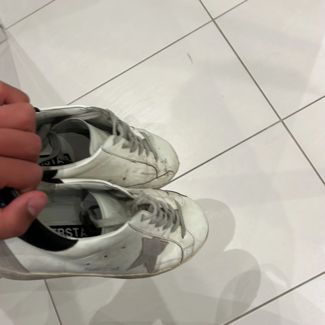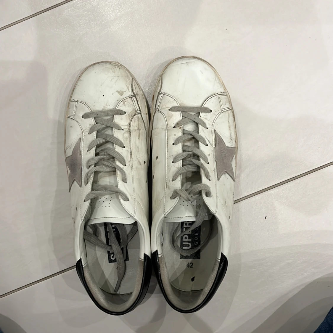Säljer ett par vita sneakers från Golden Goose med grå stjärna på sidan och svart häl. Skorna har snörning och platt sula, samt klassisk rund tå. Perfekta för dig som gillar en stilren och trendig look. Dom har blivit för små för mig och vill bli av med dom pris kan diskuteras