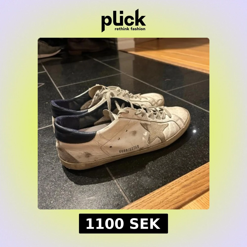 Golden Goose Superstar sneakers i vitt skinn med blå häl och grå stjärndetalj på sidan. Klassisk låg modell med snörning och platt sula. Snyggt slitna för en cool och avslappnad vibe. Perfekt för dig som gillar streetstyle och unika detaljer.