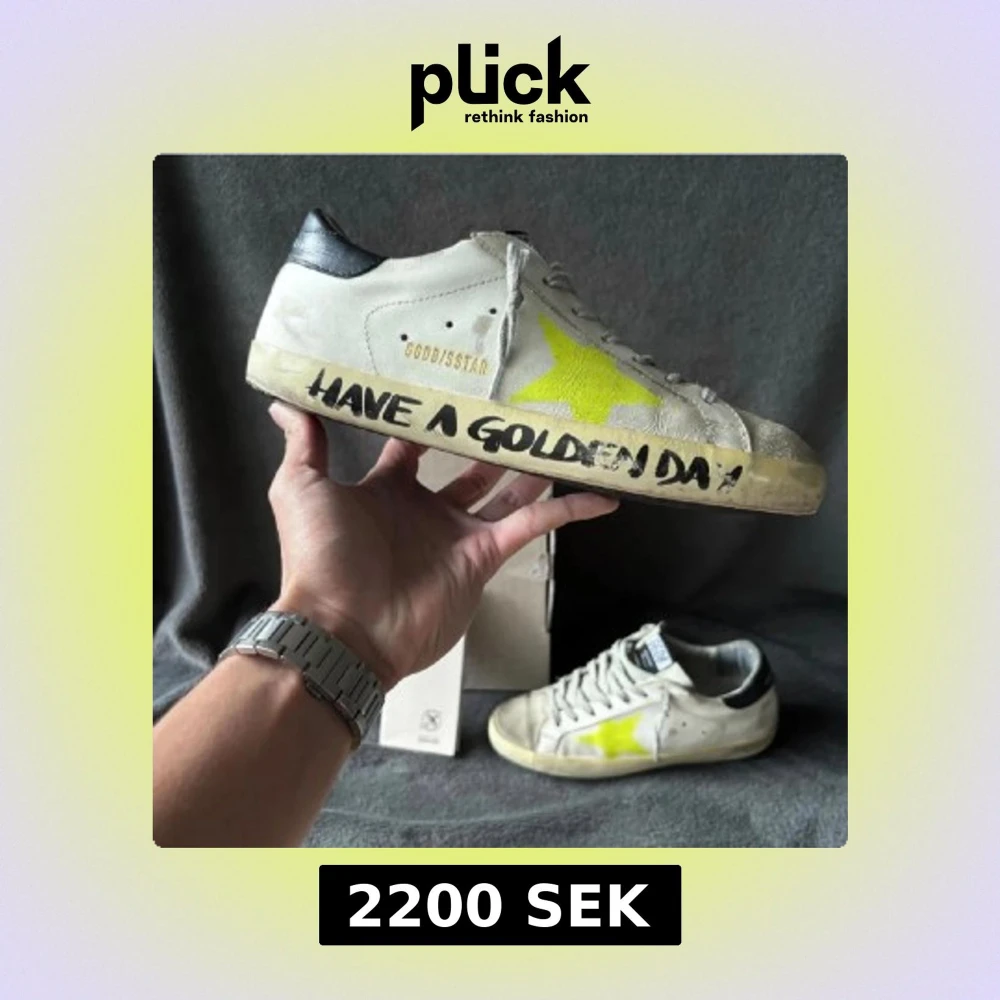 Snygga Golden Goose sneakers i vitt med en iögonfallande gul stjärna på sidan. Skorna har en svart häl och texten 'Have a Golden Day' på sulan. Perfekta nu inför våren