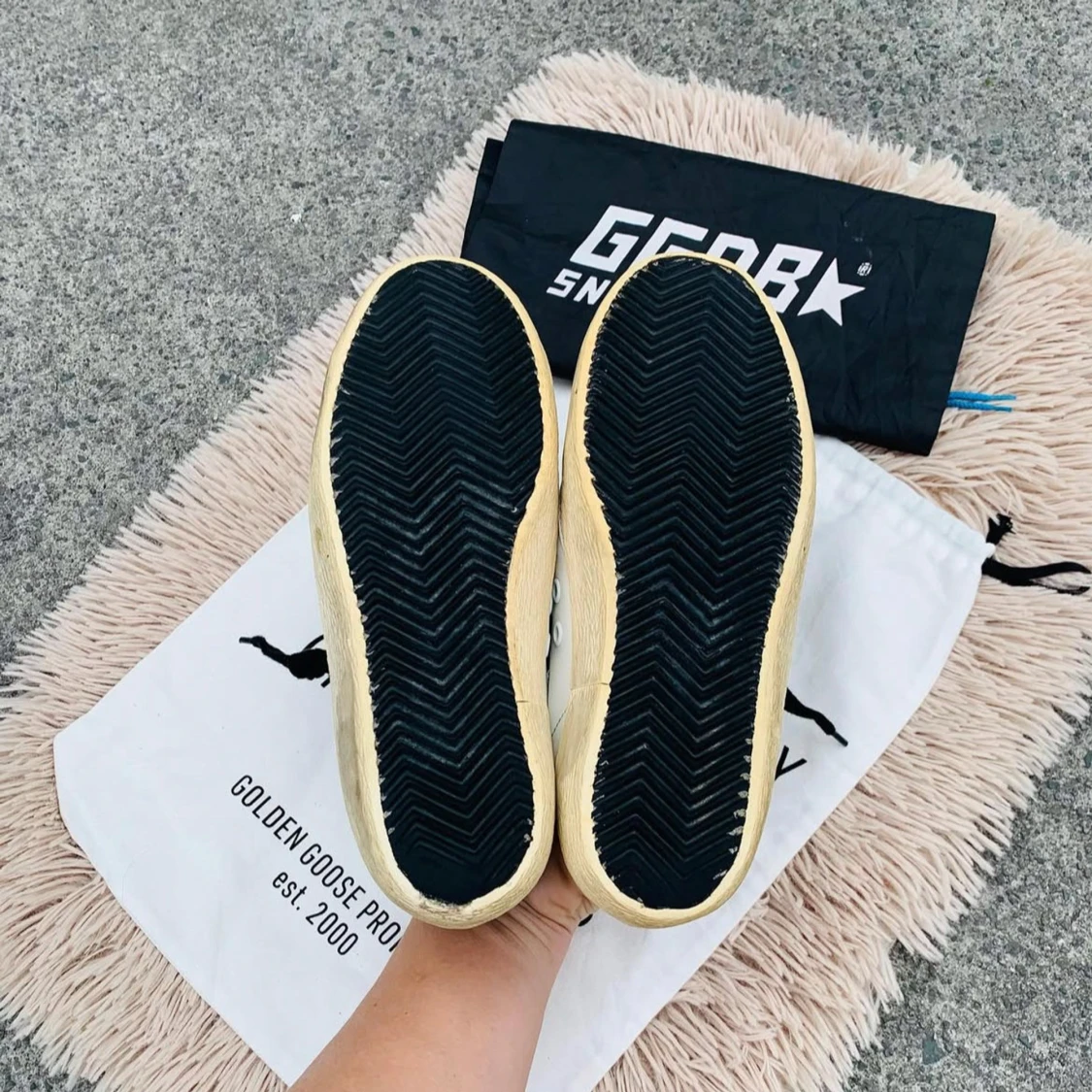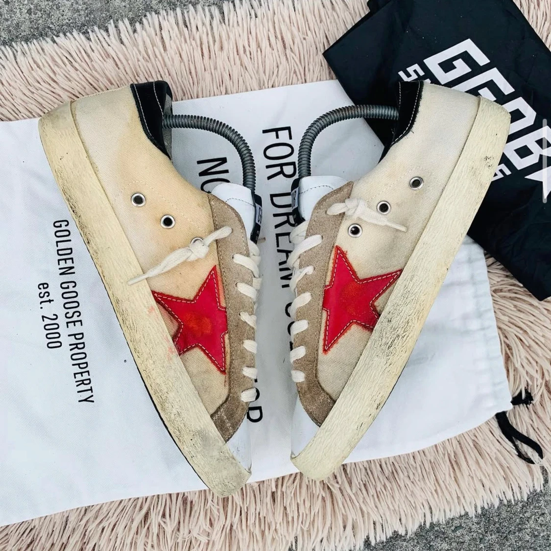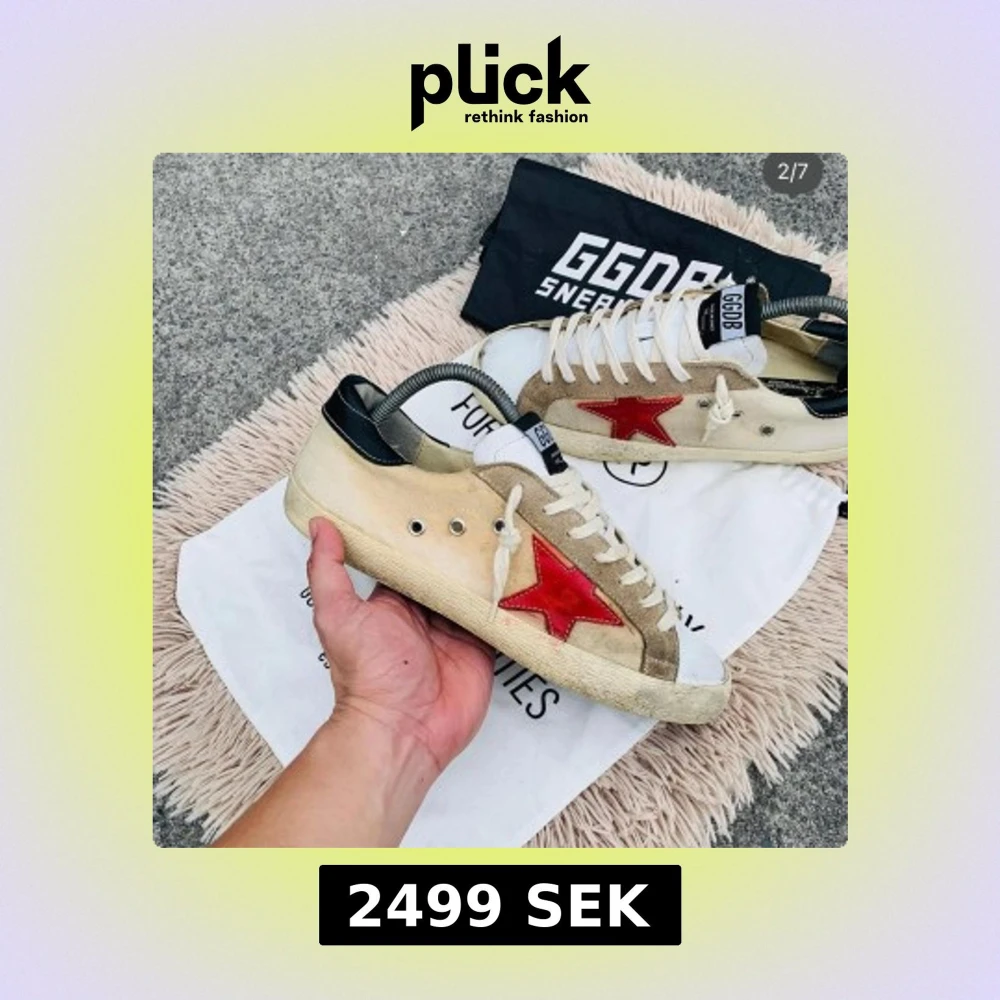 Snygga Golden Goose sneakers med en iögonfallande röd stjärna på sidan. Skorna har en beige och vit bas med svarta detaljer vid hälen. De är utrustade med snörning och har en klassisk sneakerdesign.