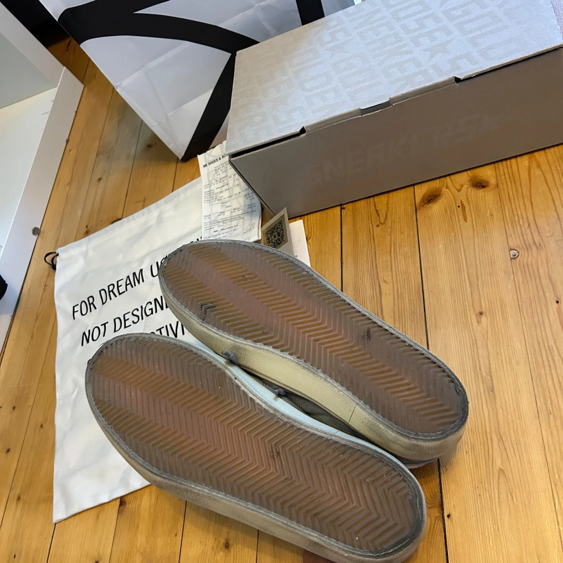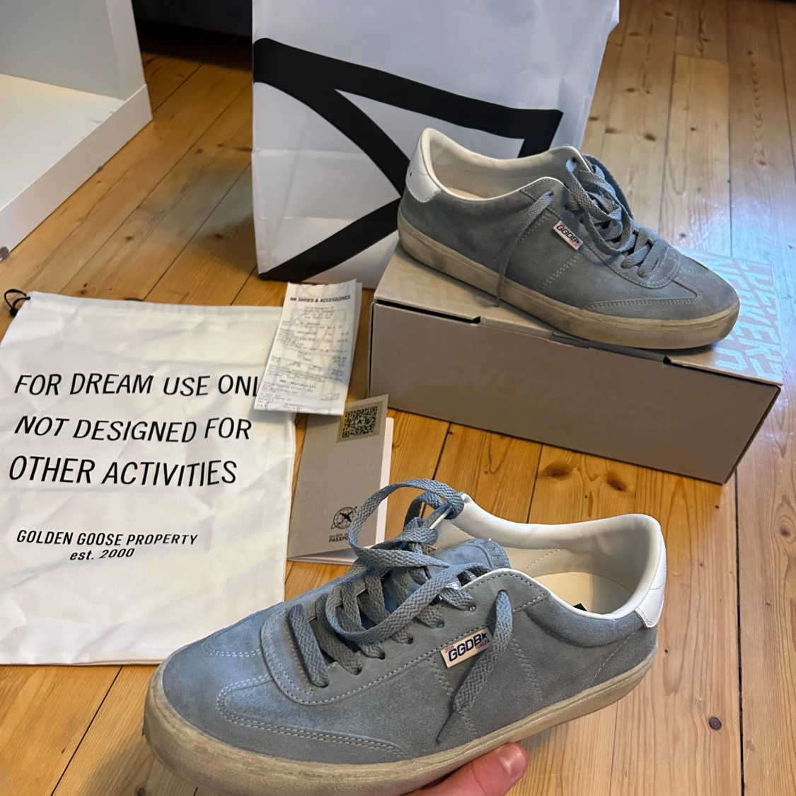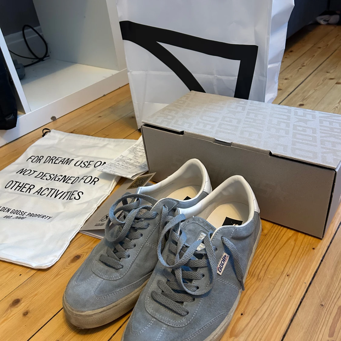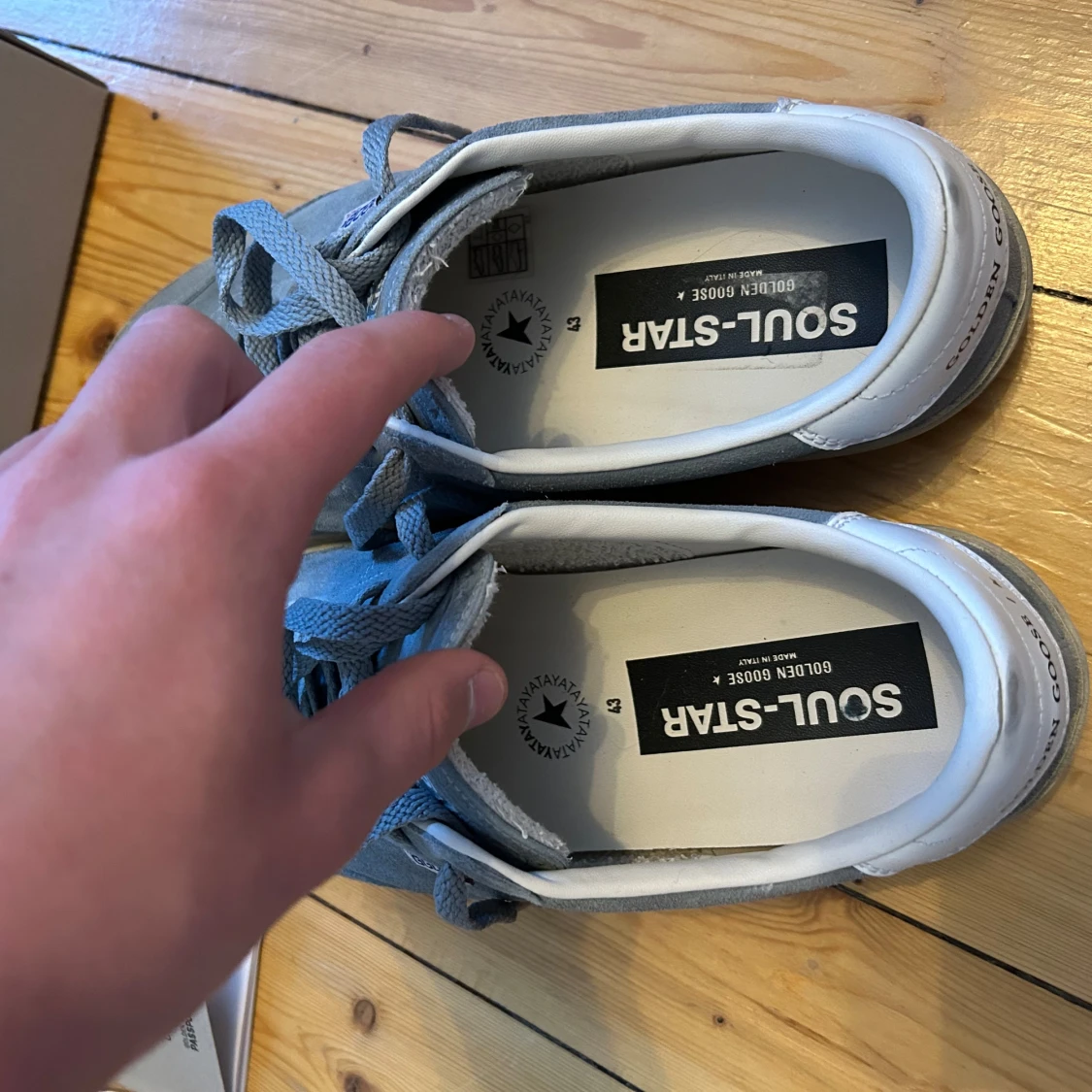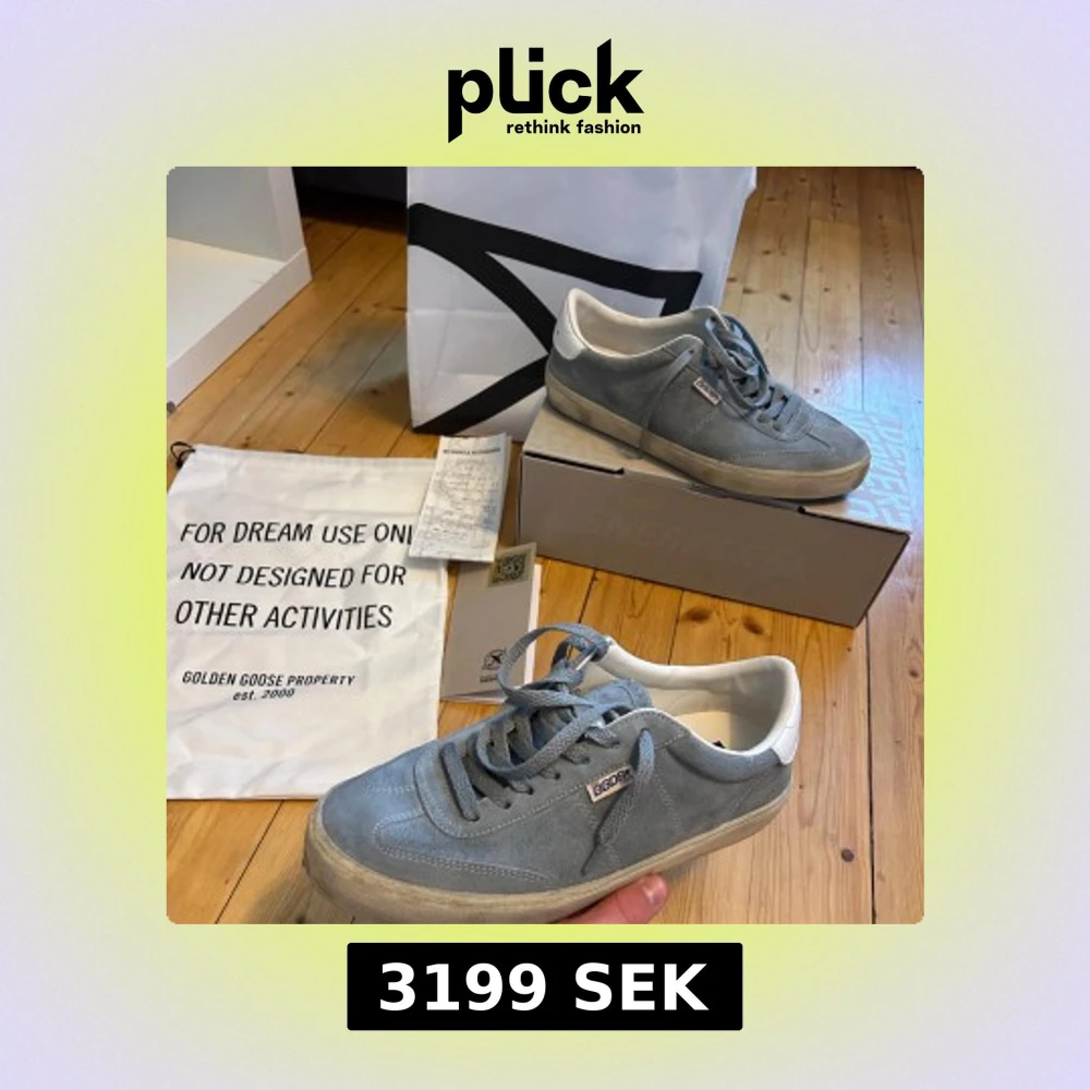 Golden Goose Soul-Star sneakers i ljusblå mocka med vita detaljer och platt sula. Snygg retrostil med rund tå, snörning och logotyp på sidan. Insidan är vit och sulan har ett klassiskt fiskbensmönster. Perfekt för dig som gillar streetwear och italiensk design. Köpta på NK Ny pris 4750kr kvitto finns. Skick 9/10 andvända 5 gånger