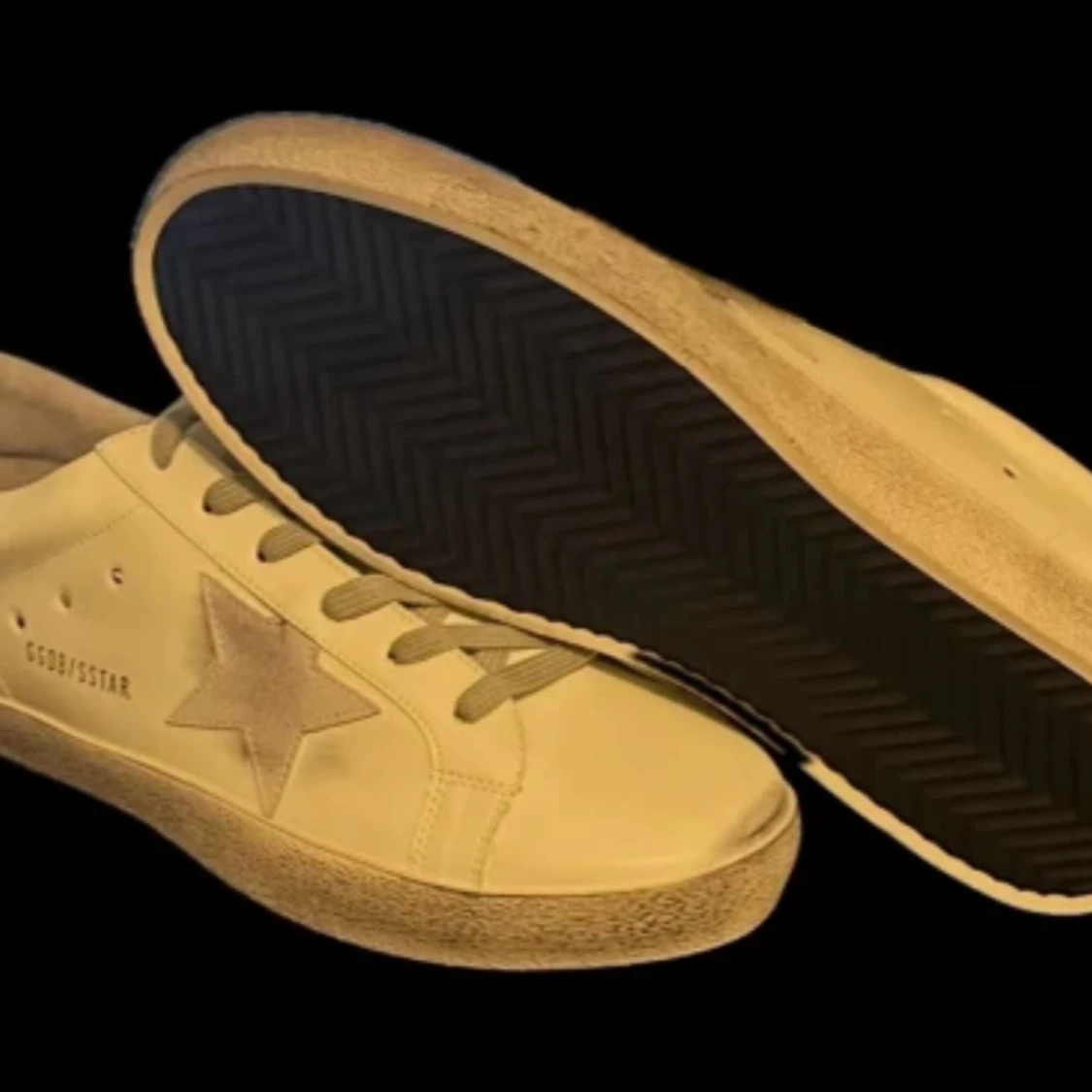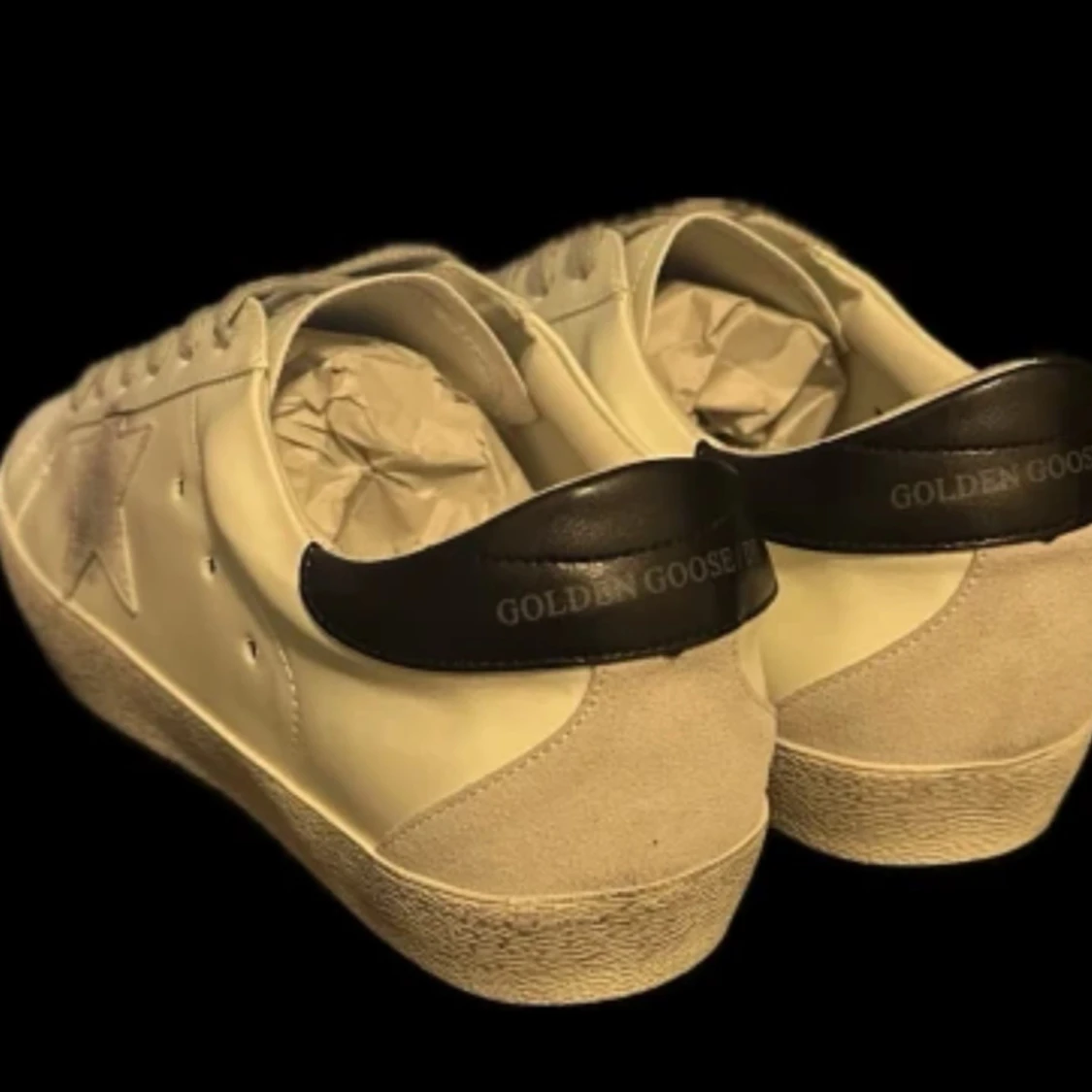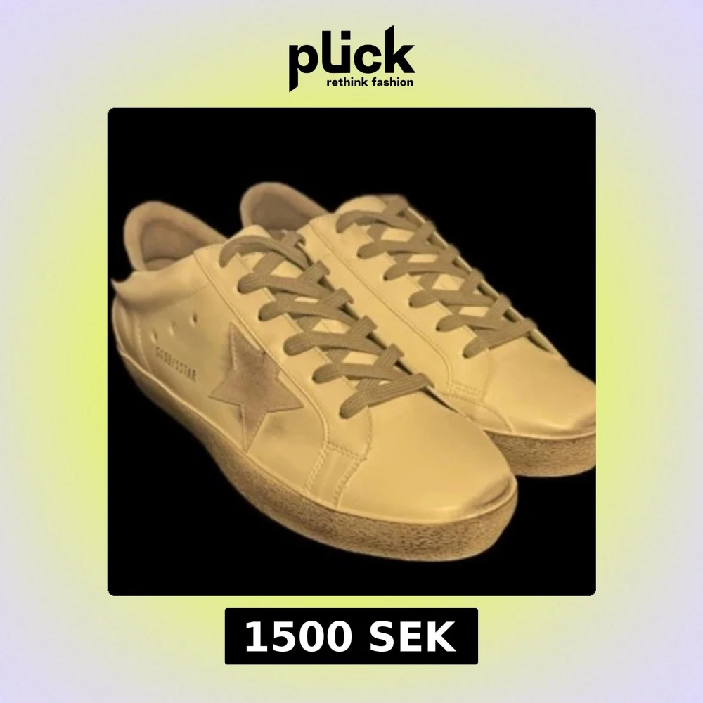 Golden Goose Superstar sneakers i beige med ikonisk stjärndetalj på sidan och svart hälflik med logga. Skorna har snörning och en slitstark gummisula. Perfekta för en avslappnad och trendig look. Priset är inte fast skriv vid frågor (skorna är rätt så slitna med dem funkar)