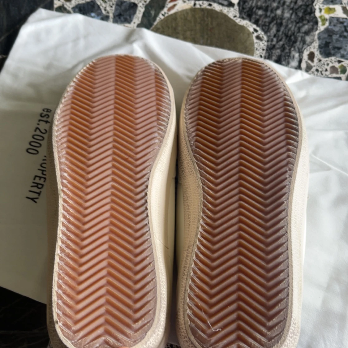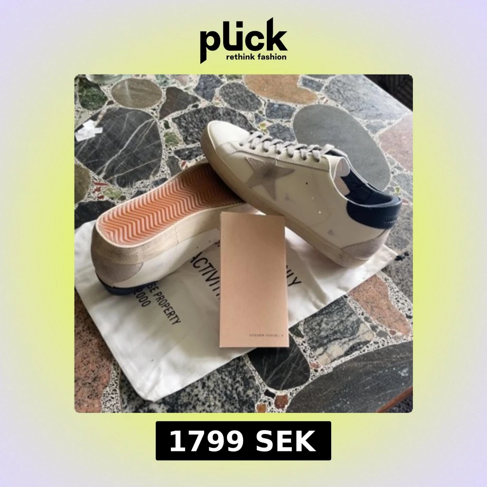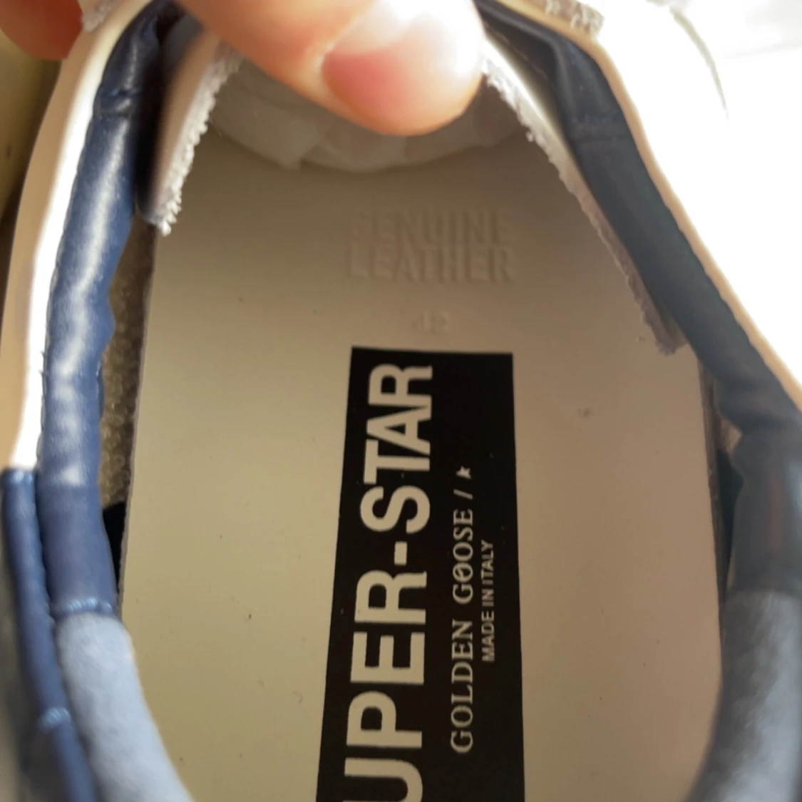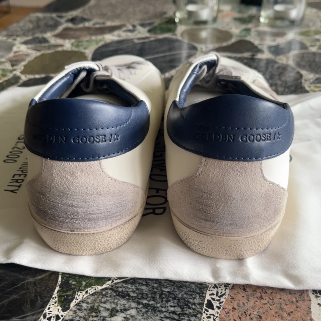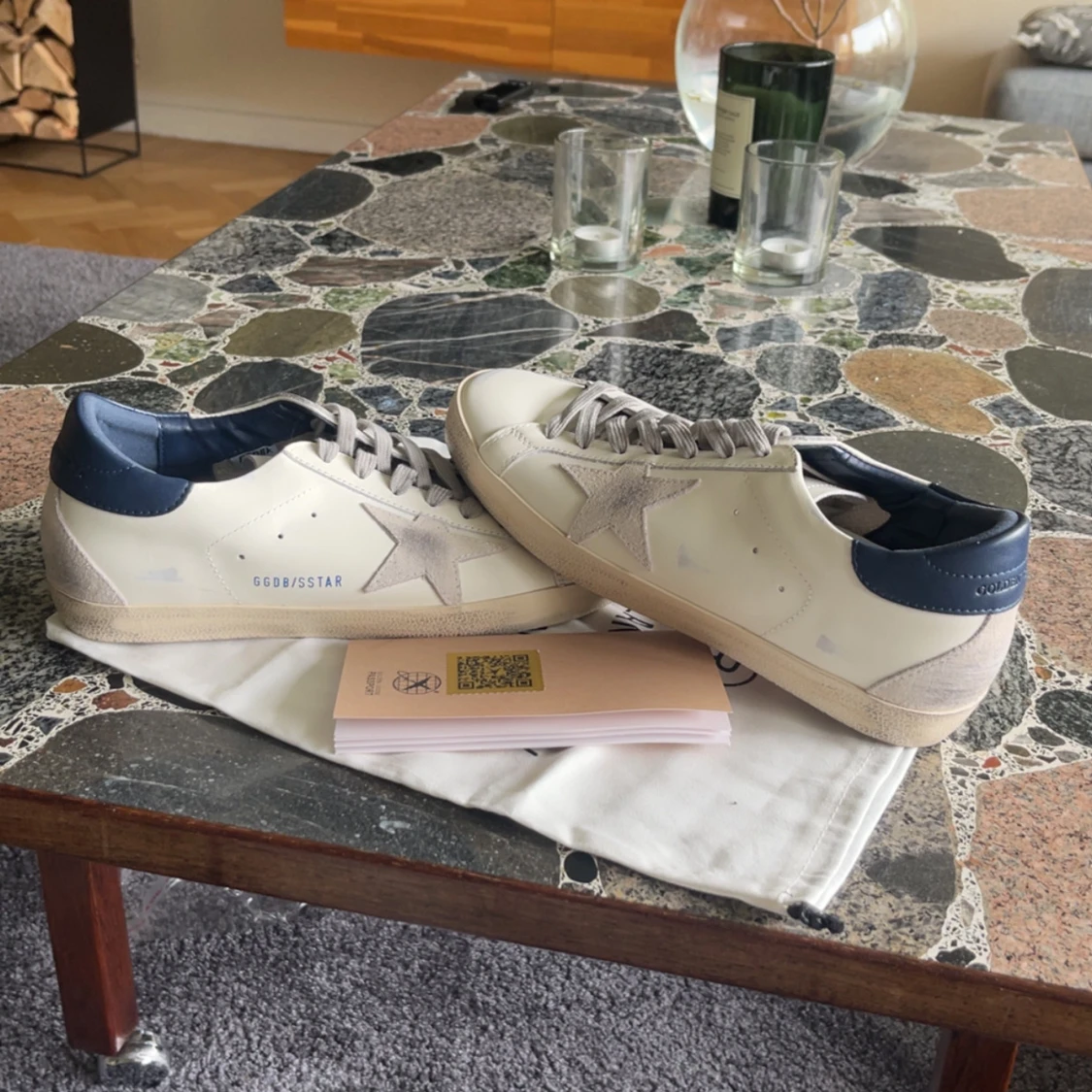 Golden Goose Superstar sneakers i vitt skinn med grå mockadetaljer och blå hälkappa. Klassisk stjärndesign på sidan, snörning framtill och platt sula med fiskbensmönster. Snygg kontrast mellan material och färger, perfekt för en trendig streetstyle.