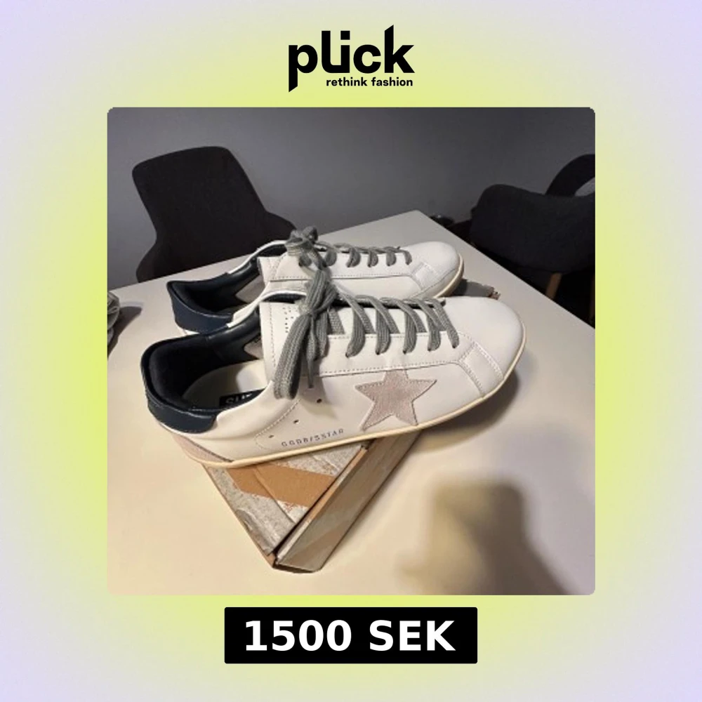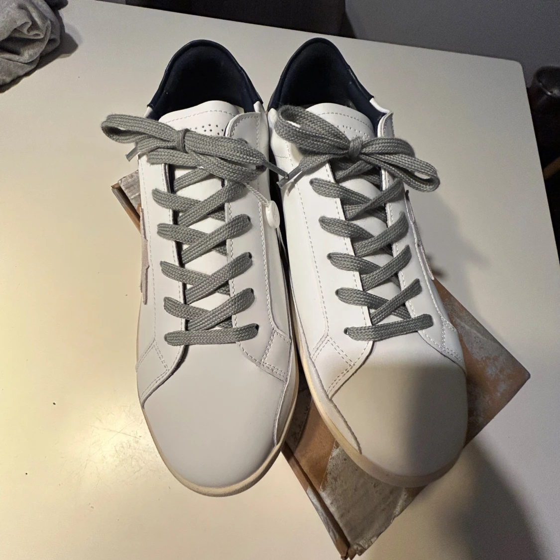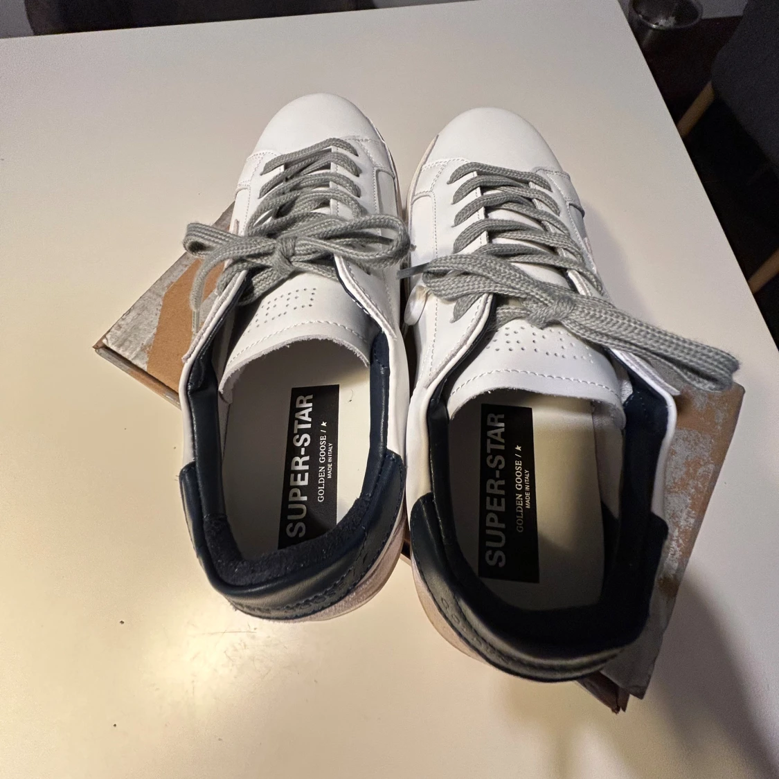 Golden Goose Superstar sneakers i vitt skinn med grå snörning och en beige stjärndetalj på sidan. Mörkblå häl och platt sula ger en clean och cool look. Perfekt för dig som gillar stilrena och trendiga sneakers med unika detaljer.
