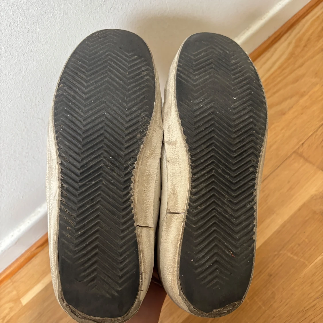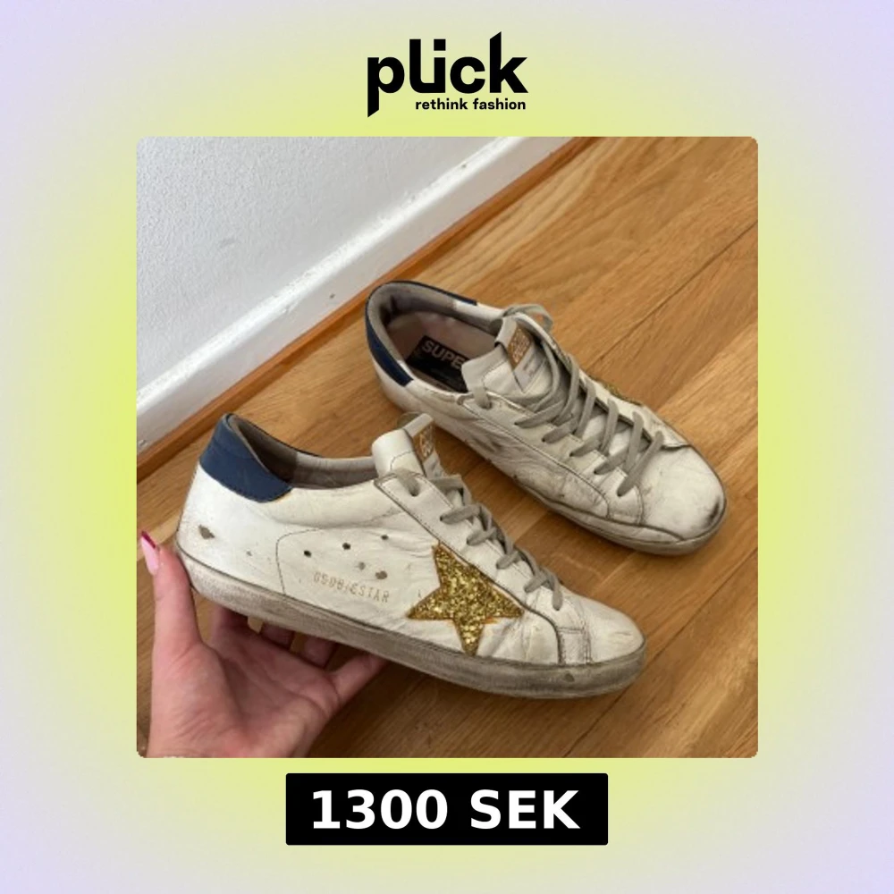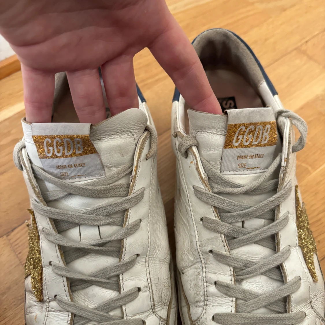 Golden Goose Superstars sneakers, Vita med guldglittrig stjärna med mörkblått vid hälen. Skorna är andvända i gott skick. Storlek 39