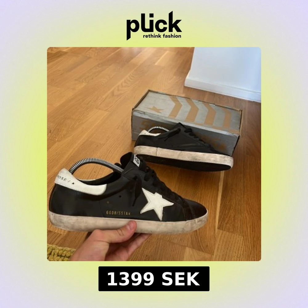 Golden Goose sneakers i svart skinn med vit stjärndetalj på sidan och vit häl med logotyp. Klassisk låg modell med svarta snören och platt sula. Snygg kontrast mellan svart och vitt, perfekt för dig som gillar streetstyle och italiensk design.