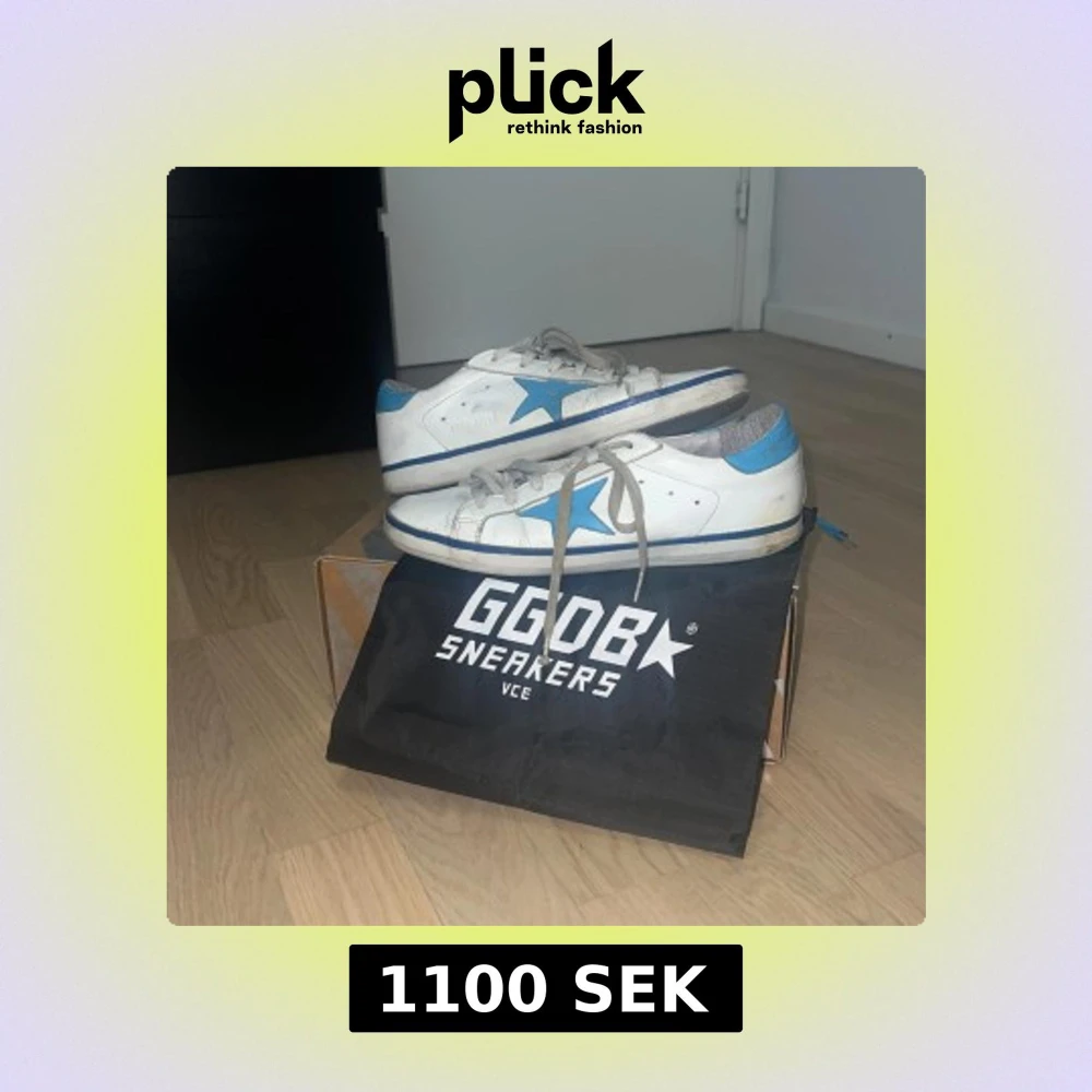 Golden Goose sneakers i vitt skinn med blå detaljer och en blå stjärna på sidan. Skorna har snörning, platt sula och rund tå. Klassisk low-top modell med autenticitetsmärkning och originalpåse. Perfekt för dig som gillar en cool och avslappnad stil. Pris kan diskuteras