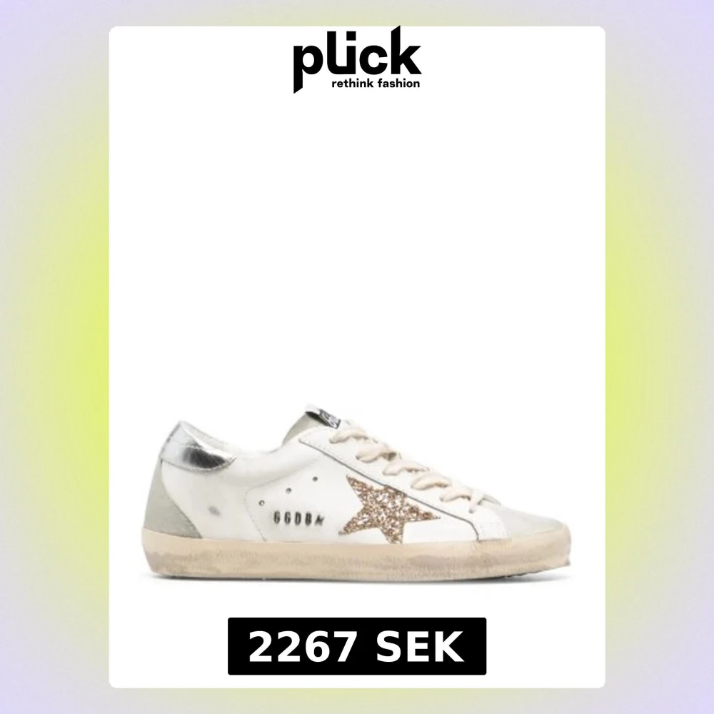 Golden Goose sneakers i vitt skinn med en glittrig guldstjärna på sidan och silverfärgad häl. Skon har snörning, beige sula och detaljer i mocka vid tån och hälen. Perfekt för dig som vill ha en unik och trendig look.