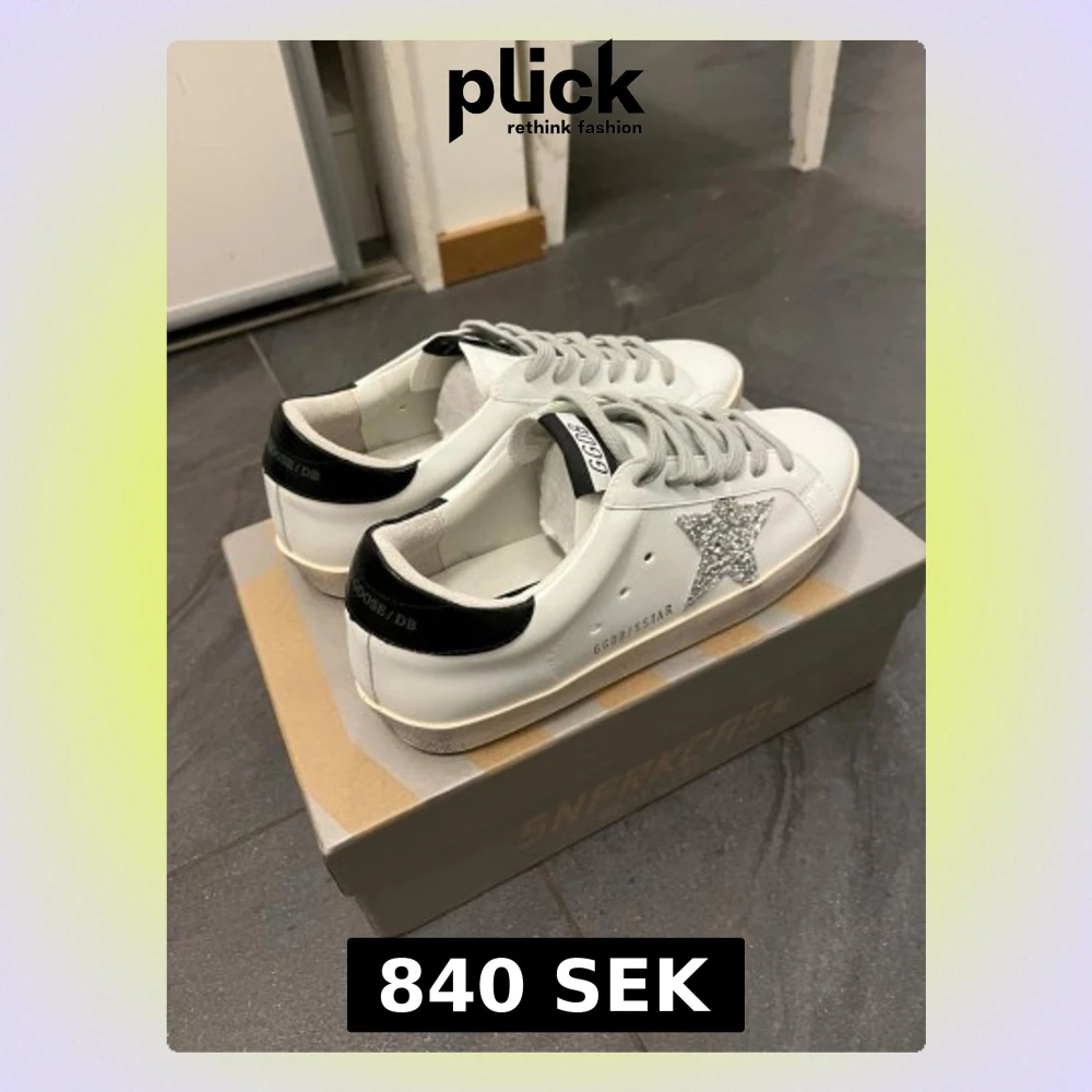 Golden Goose sneakers i vitt skinn med svart häl och silverglittrig stjärna på sidan. Klassisk låg modell med grå snörning och platt sula. Snygg GGDB-detalj på hälen och tungan. Kommer med originalkartong och påse.