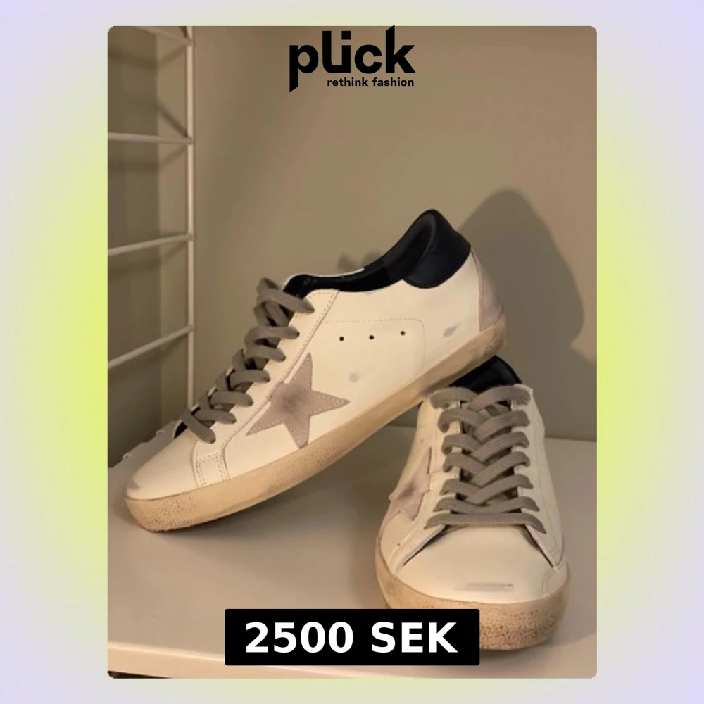 Snygga vita sneakers från Golden Goose med grå mockadetaljer och en ikonisk stjärna på sidan. Skorna har grå snörning, mörkblå häl och platt sula. Perfekta för dig som gillar en cool och avslappnad stil med unika detaljer.ps boxen medföljer