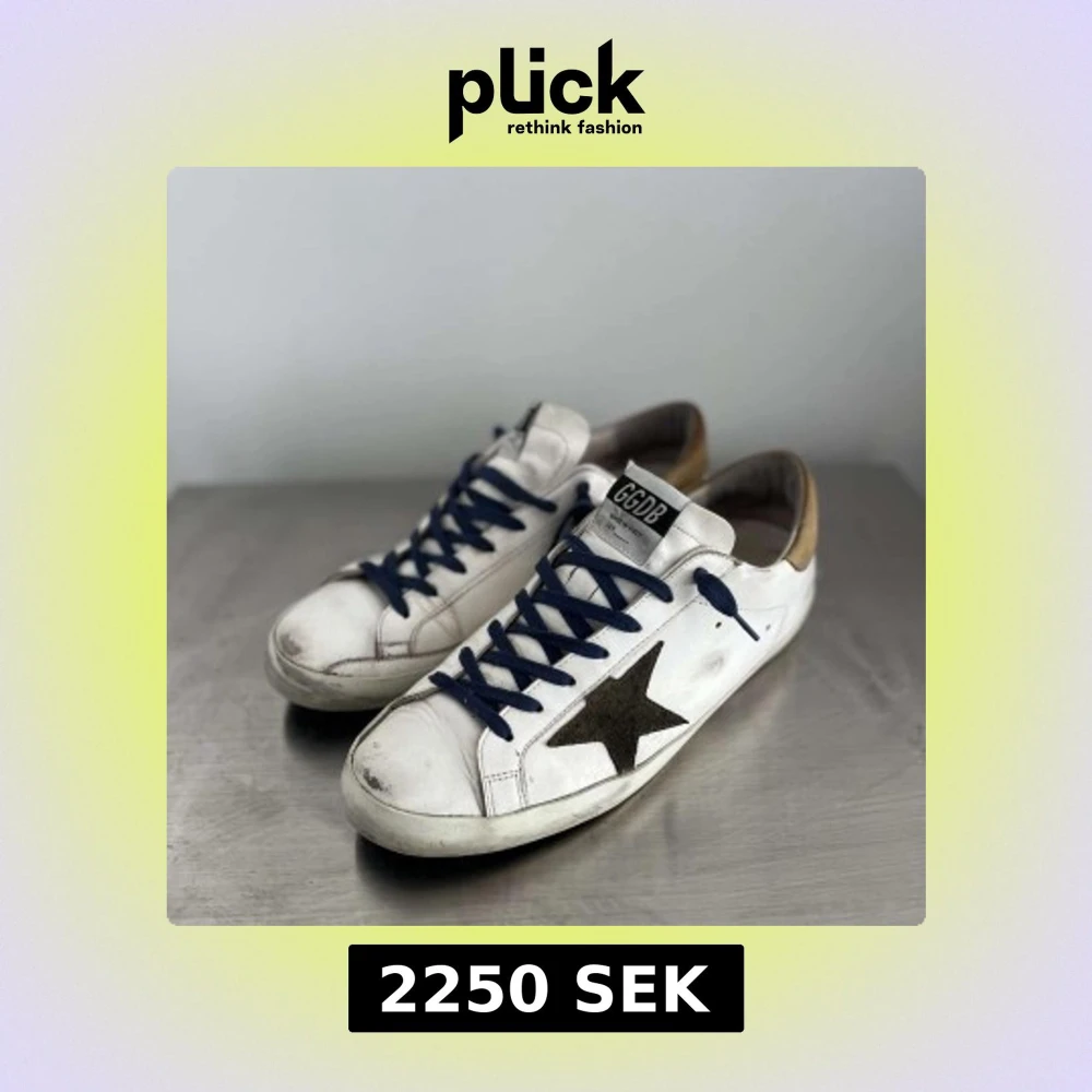 Golden Goose sneakers i vitt skinn med mörkblå snörning och svart stjärndetalj på sidan. Hälpartiet är brunt och skon har en klassisk låg profil. Snygg kontrast mellan färgerna och den ikoniska GGDB-tungan framtill.
