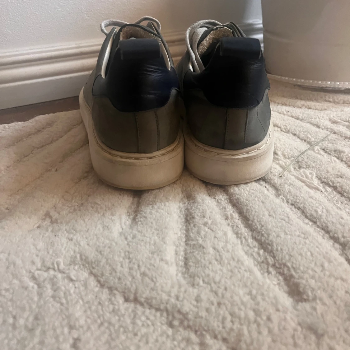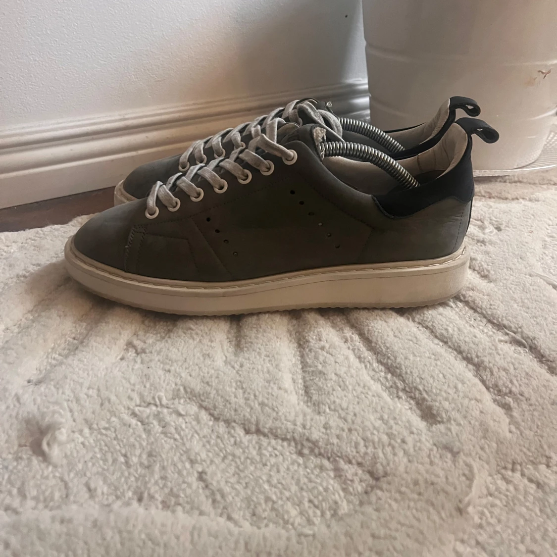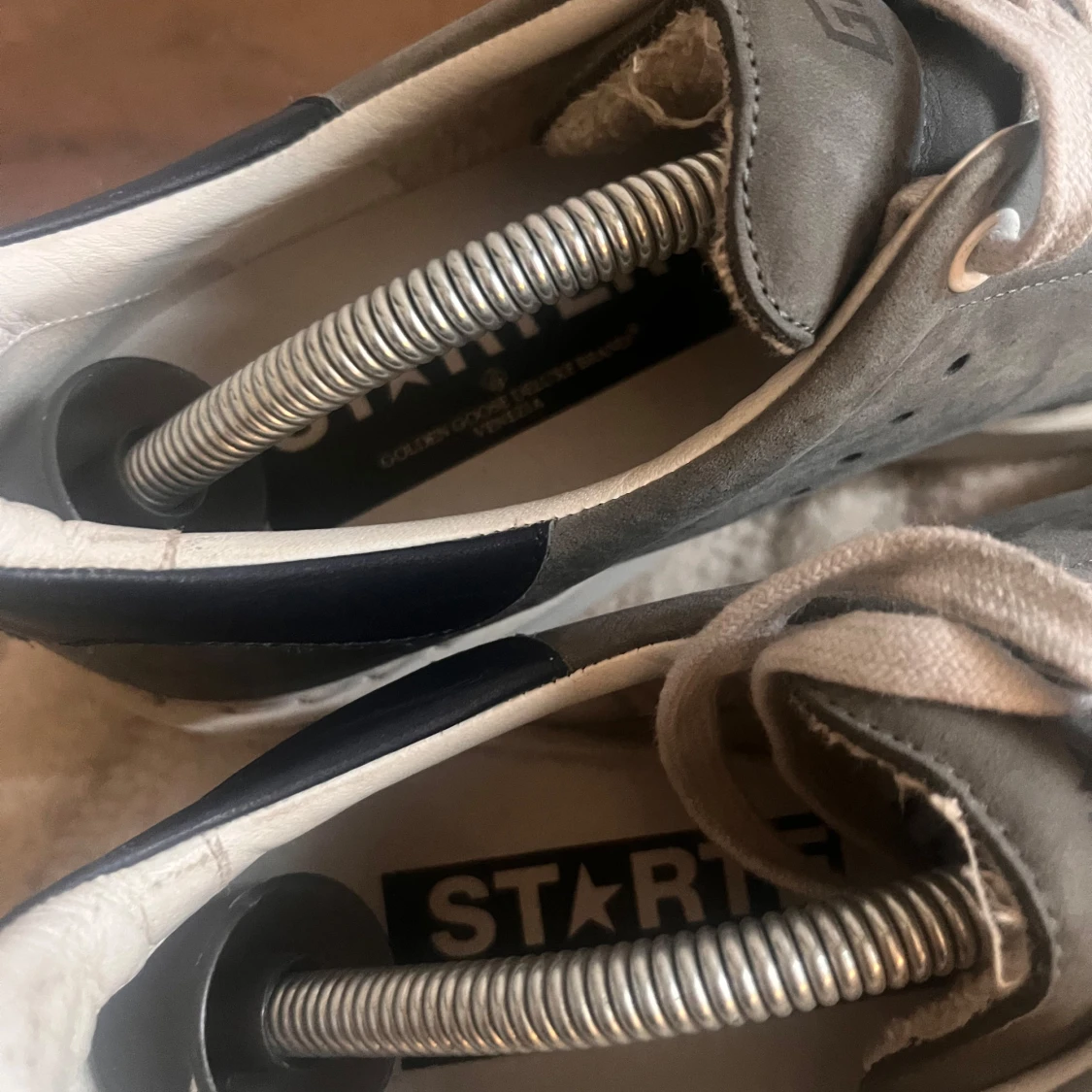 Snygga grå sneakers från Golden Goose med vit sula och vita snören. Ovandelen är i mocka och detaljer i mörkblått skinn vid hälen. Klassisk rund tå och diskreta hål på sidorna för extra stil. Perfekta för dig som gillar en clean och trendig look.