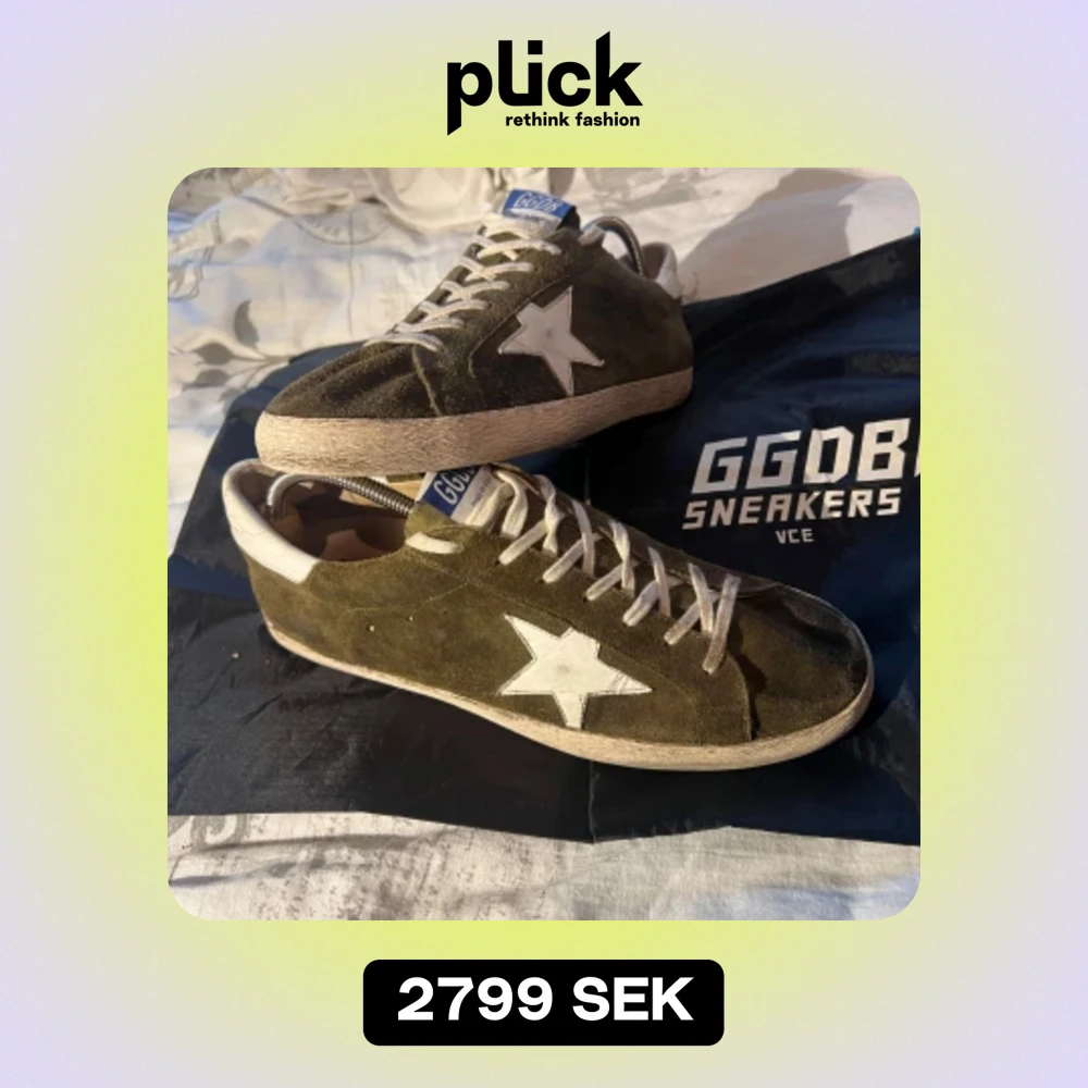 Säljer dessa sjukt snygga Golden goose i grön mocka som går att styla till allt nu under sommaren. Tillkommer endast skorna, Hör av er vid frågor🙌