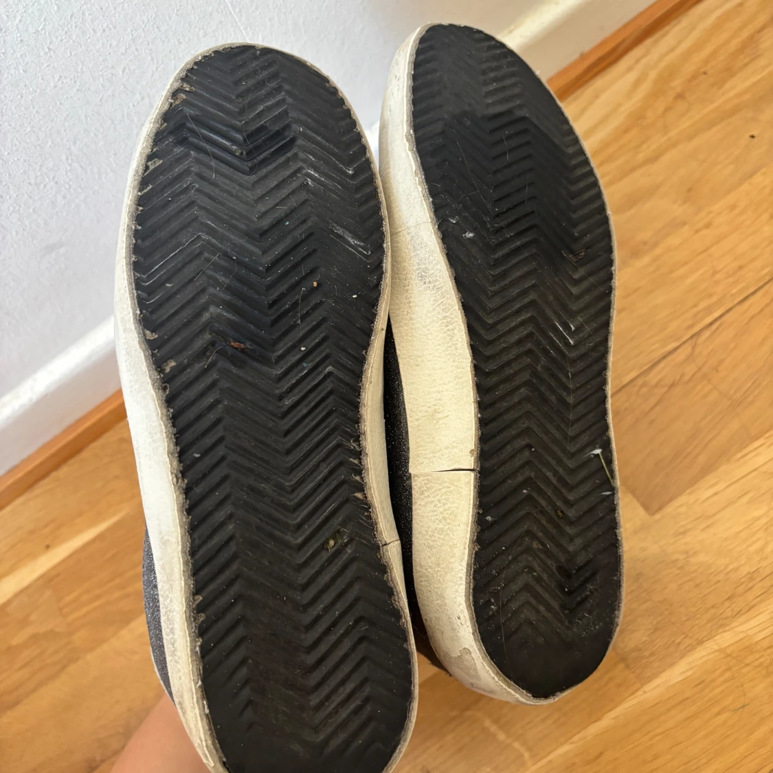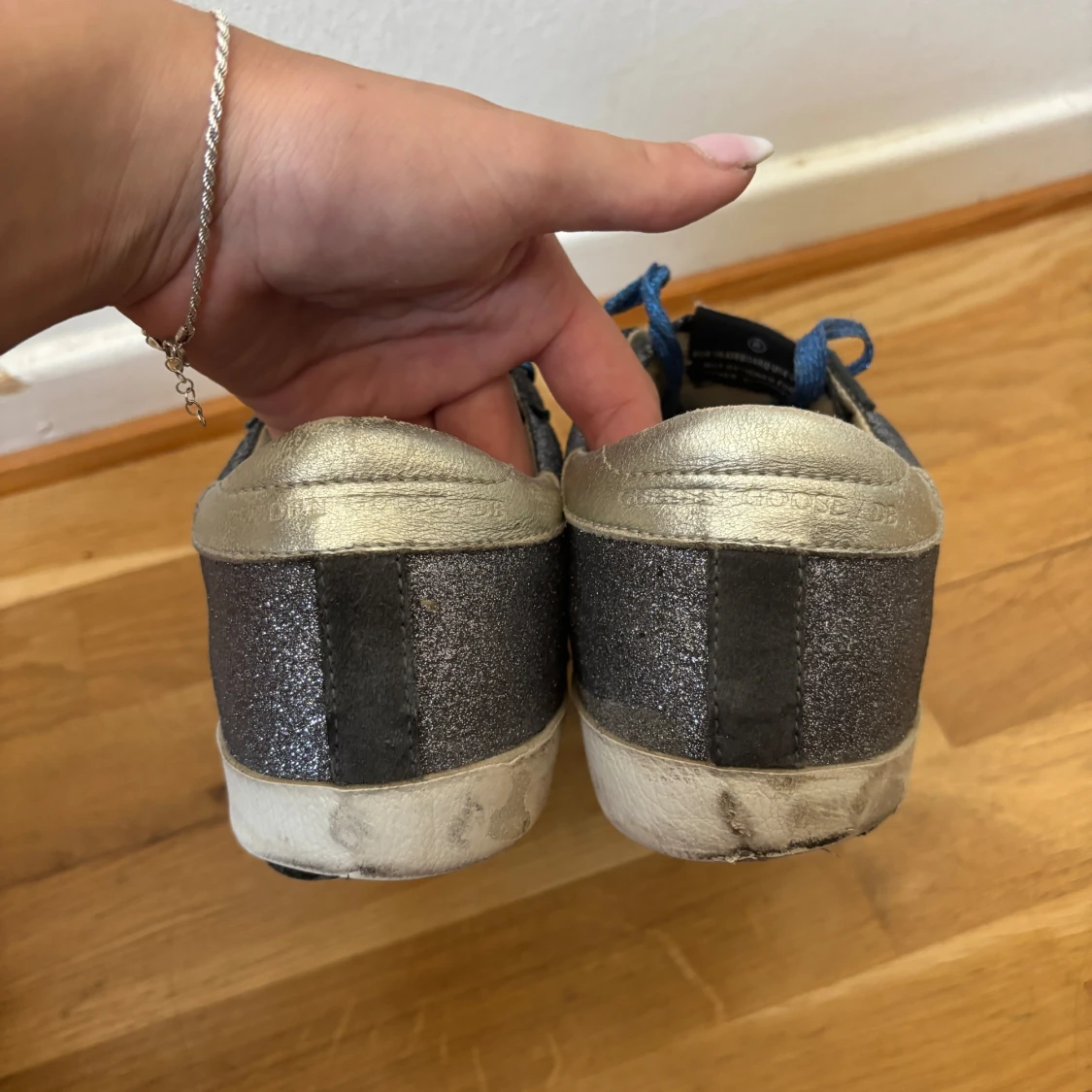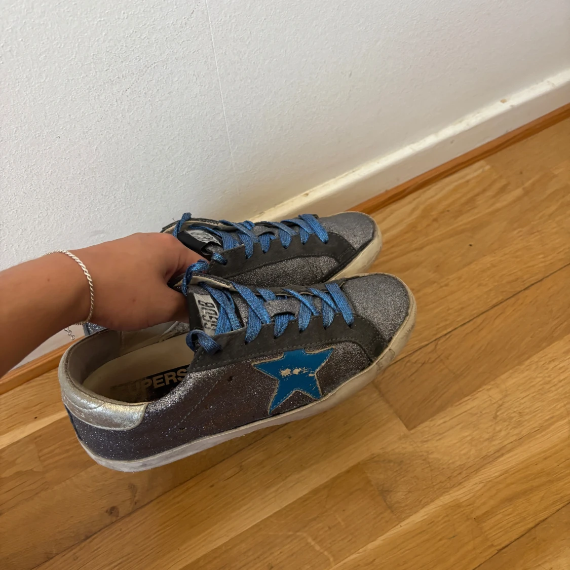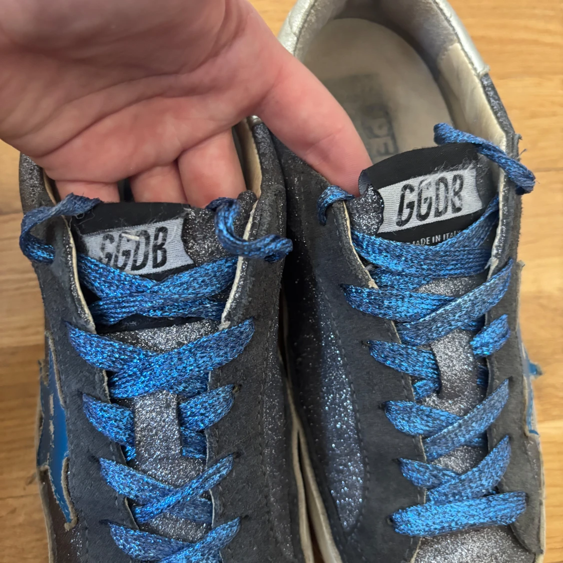 Golden Goose superstars i glitter blå, skosnörena är också glittriga. Skorna är andvända men har ingen större defekt. Storlek 37(endast skor medföljer i köpet)