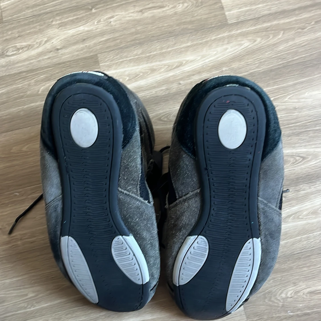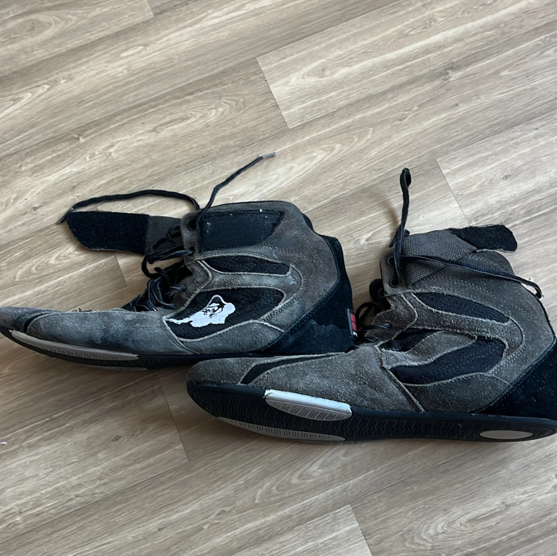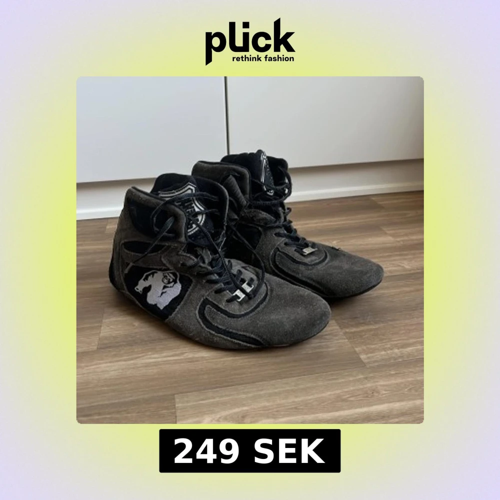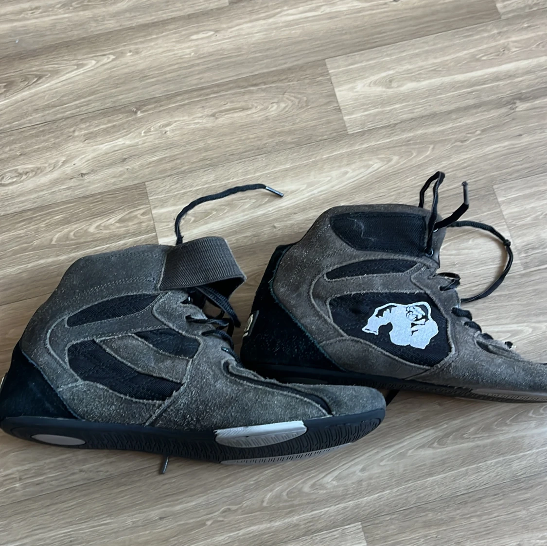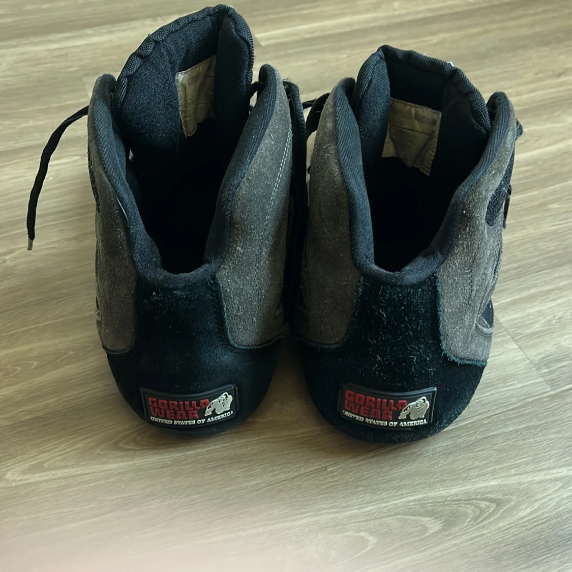 Säljer ett par svarta och grå träningsskor från Gorilla Wear med högt skaft och snörning. Skorna har en cool gorilla-logga på sidan och är gjorda i mocka och syntetmaterial. Perfekta för gymmet eller styrketräning.