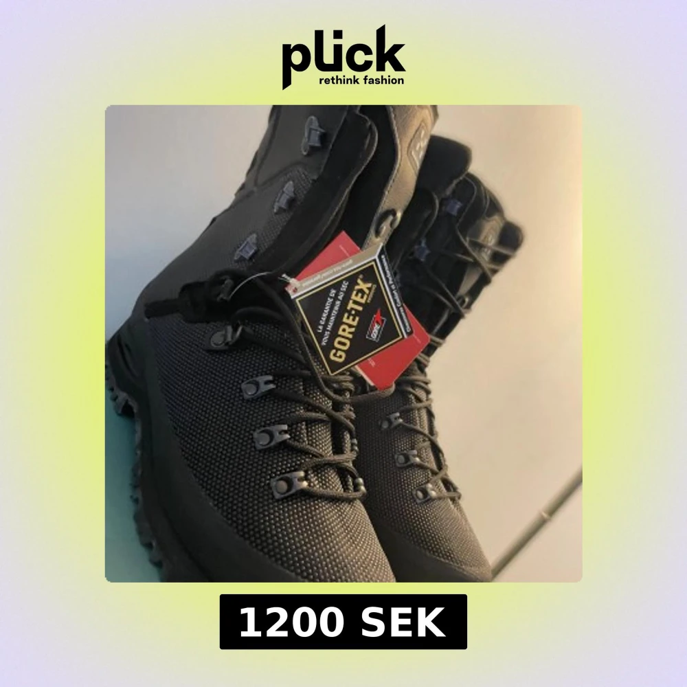 Säljer ett par svarta Haglöfs kängor med Gore-Tex membran och Vibram-sula. Skorna har grov mönstrad sula, snörning med metallhakar och slitstark syntettextil på ovansidan. Perfekta för dig som vill ha grymt grepp och vattentäthet på äventyret.
