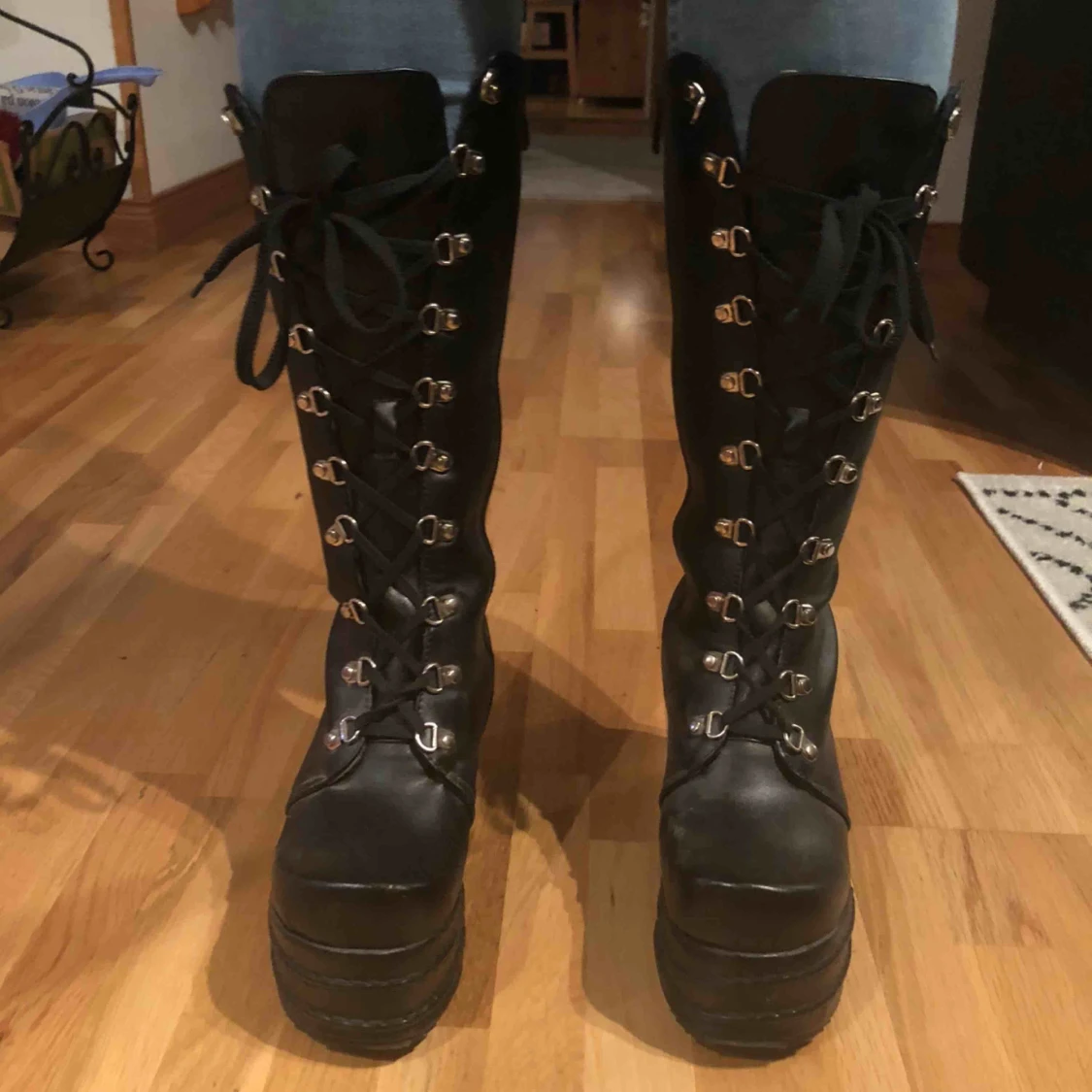 Platå kängor i gott skick, 8 cm höga och stövelskaftet är 53cm. Dragkedja samt snörning så det går att anpassa beroende på hur stora ben man har. Kan frakta eller mötas i Eskilstuna, Flen eller Katrineholm✨