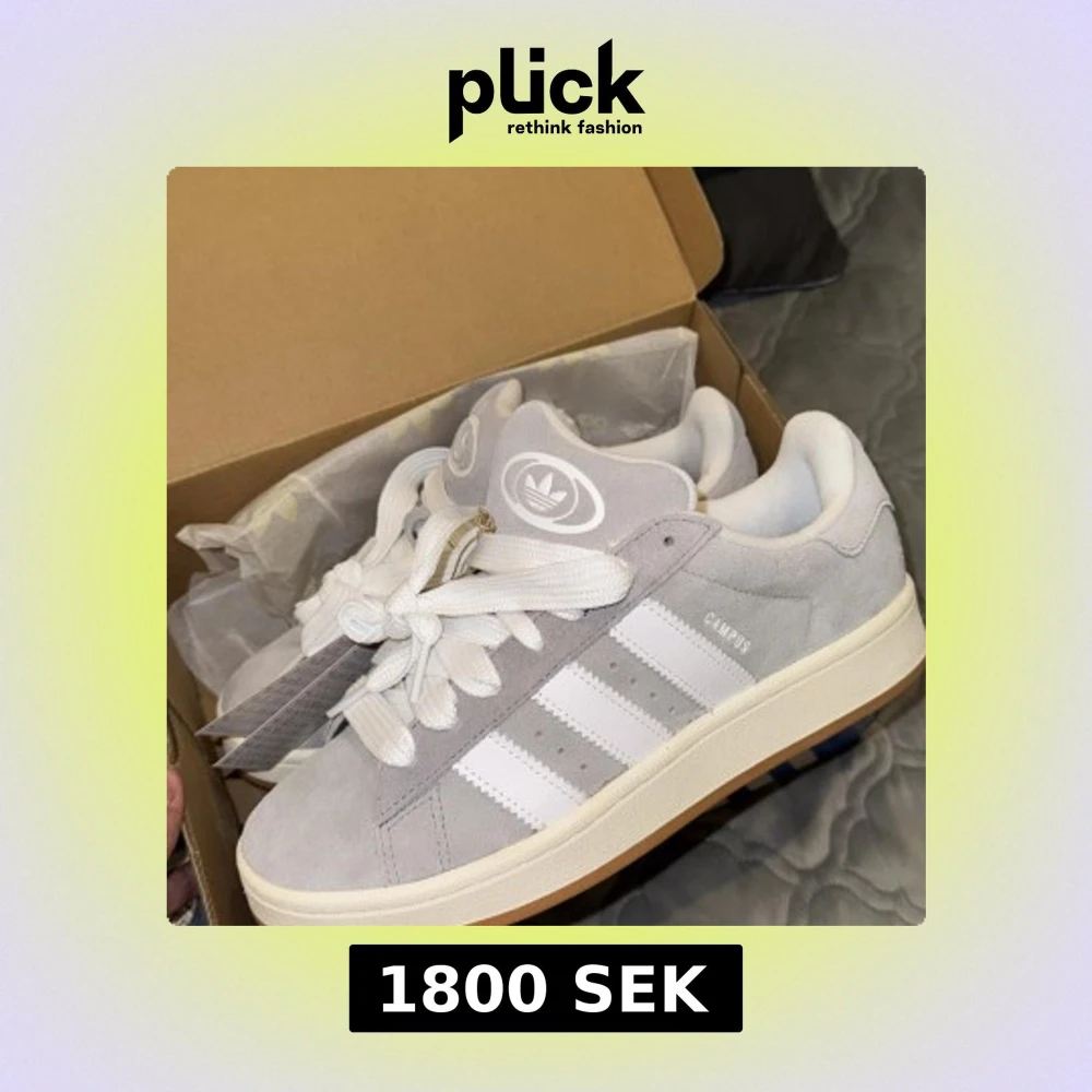 Snygga grå Adidas Campus sneakers med vita ränder och snörning. Perfekta för en stilren och avslappnad look. Helt nya storlek 41 1/3 säljs för 1800 men priset går att diskutera.