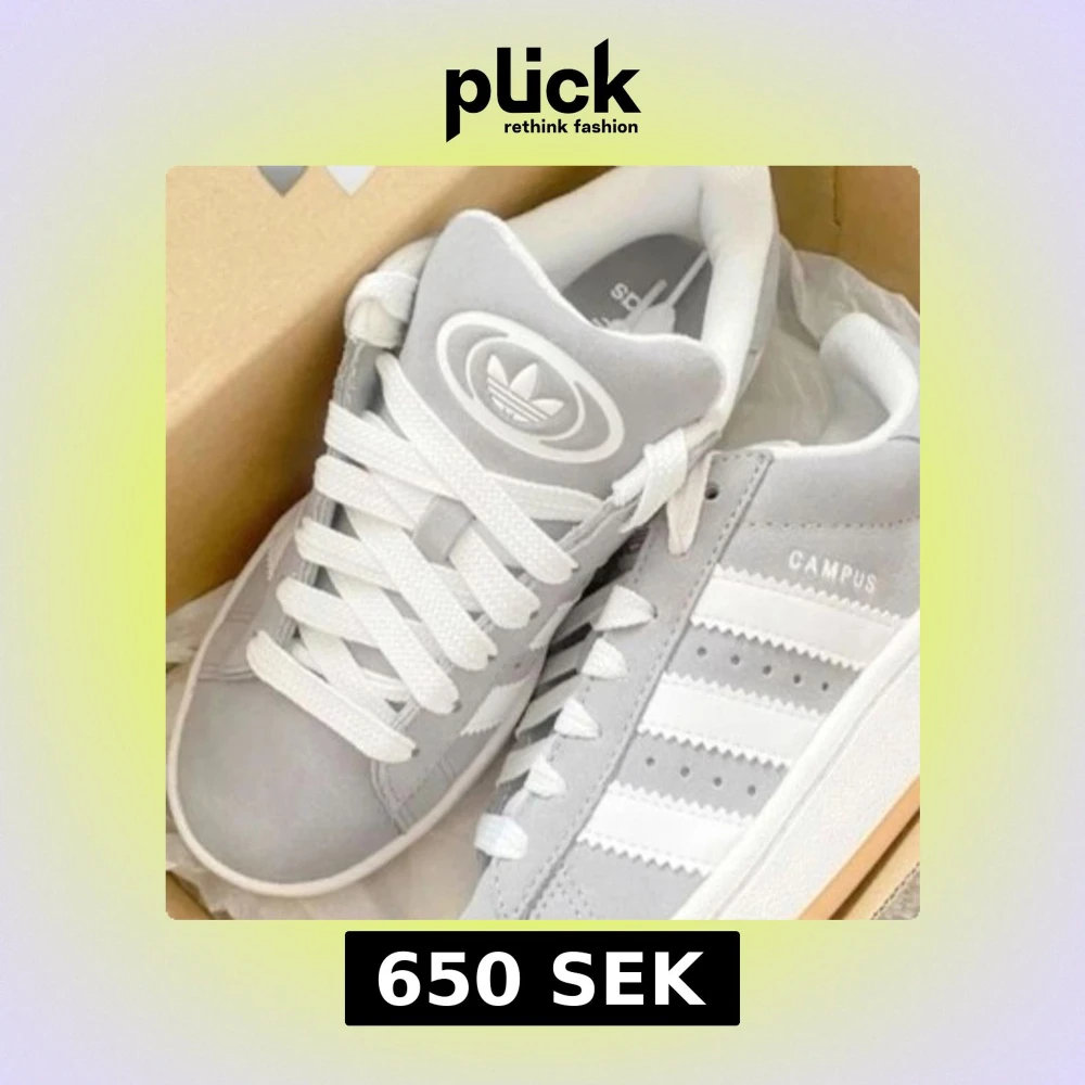 Säljer ett par stilrena grå Adidas Campus sneakers med vita detaljer och klassiska tre ränder. Skorna har en rund tå och snörning framtill. Perfekta för en avslappnad stil. Inköpta från SolePlus för 1500kr. Använt skick med en defekt vid sidan av skon som jag kan skicka bild på privat men annars i bra skick, tvättas även innan jag postar dom! Super sköna och fina till vår och sommar!! Vid fler frågor skriv privat💗💗