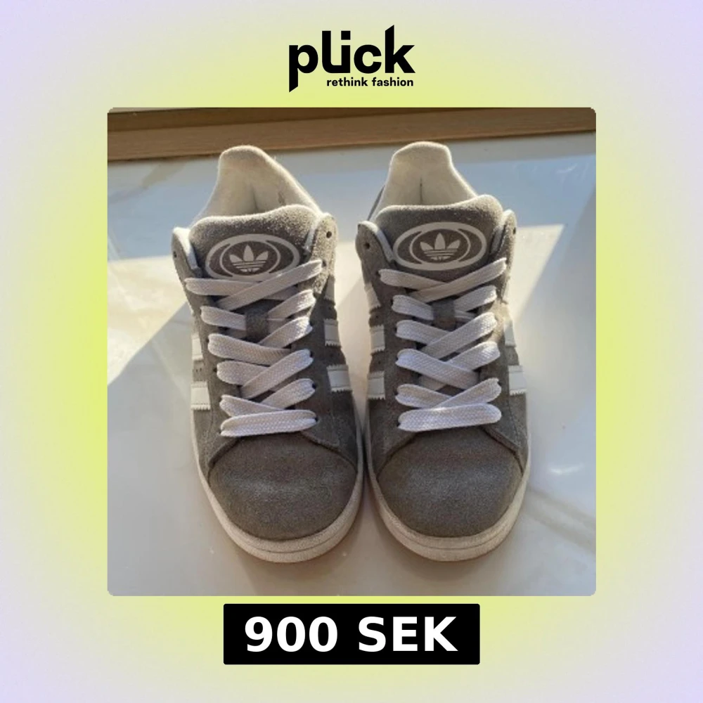 Snygga grå Adidas Campus sneakers i mocka med vita detaljer och klassiska tre ränder på sidan. Skorna har en vit sula med gummifärg undertill och snörning framtill. Perfekta för en stilren look. Pris kan diskuteras 💖