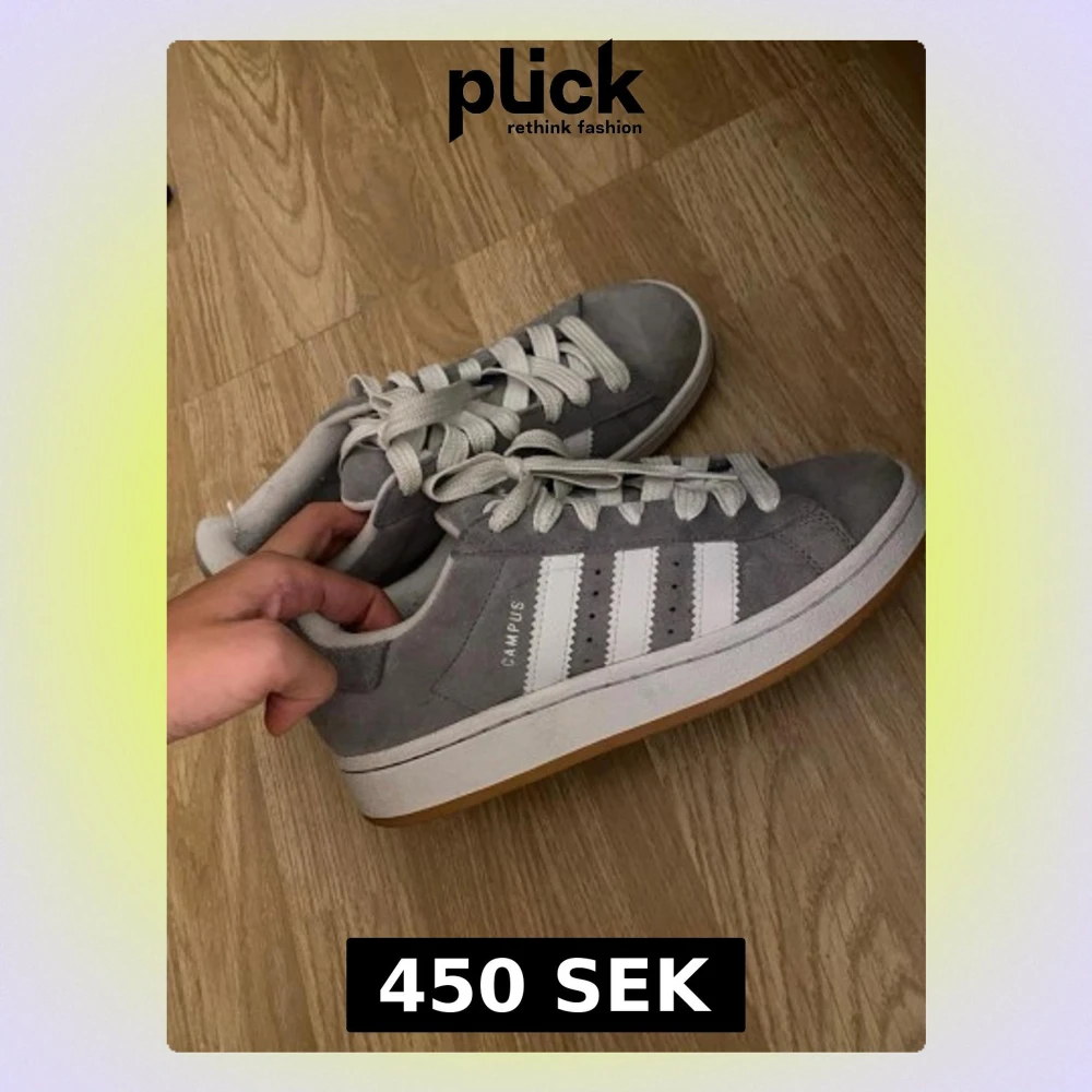 Säljer ett par grå Adidas Campus sneakers med klassiska vita ränder på sidorna och vit snörning. Skorna har en rund tå, platt sula och är tillverkade i mocka med gummisula i beige ton. Perfekta för dig som gillar stilrena och tidlösa sneakers. Nästan helt nya använt vid 2 tillfällen bara.