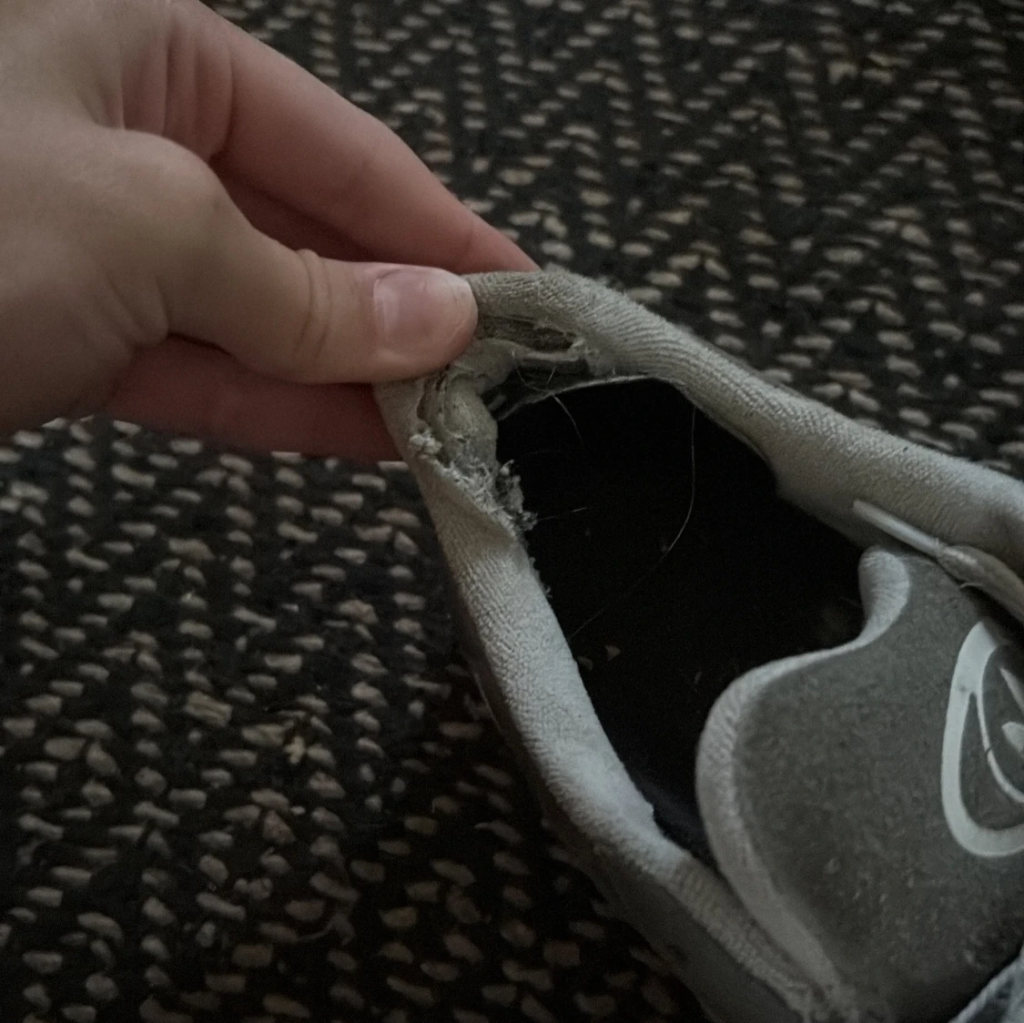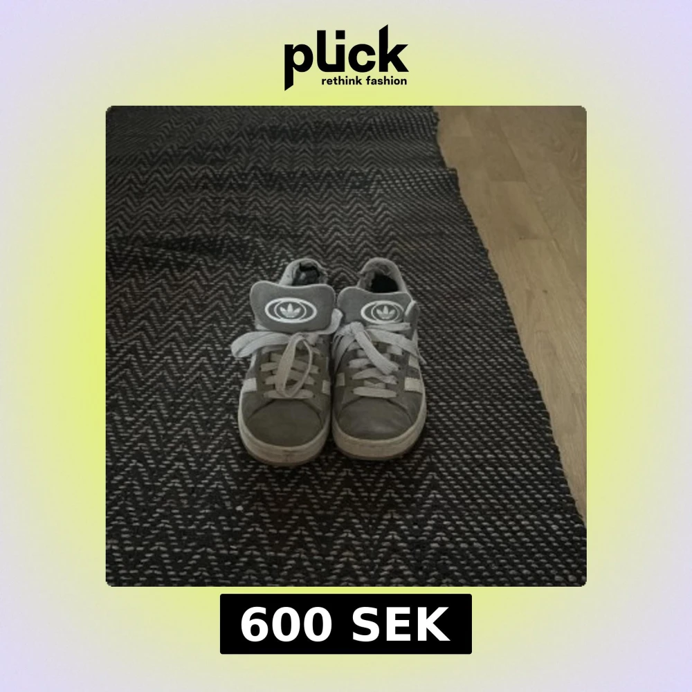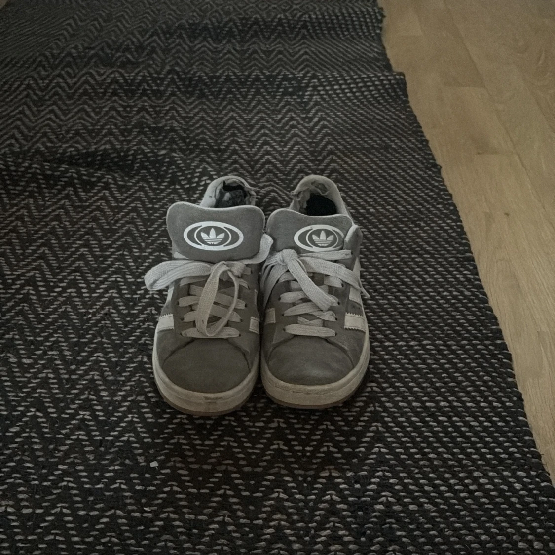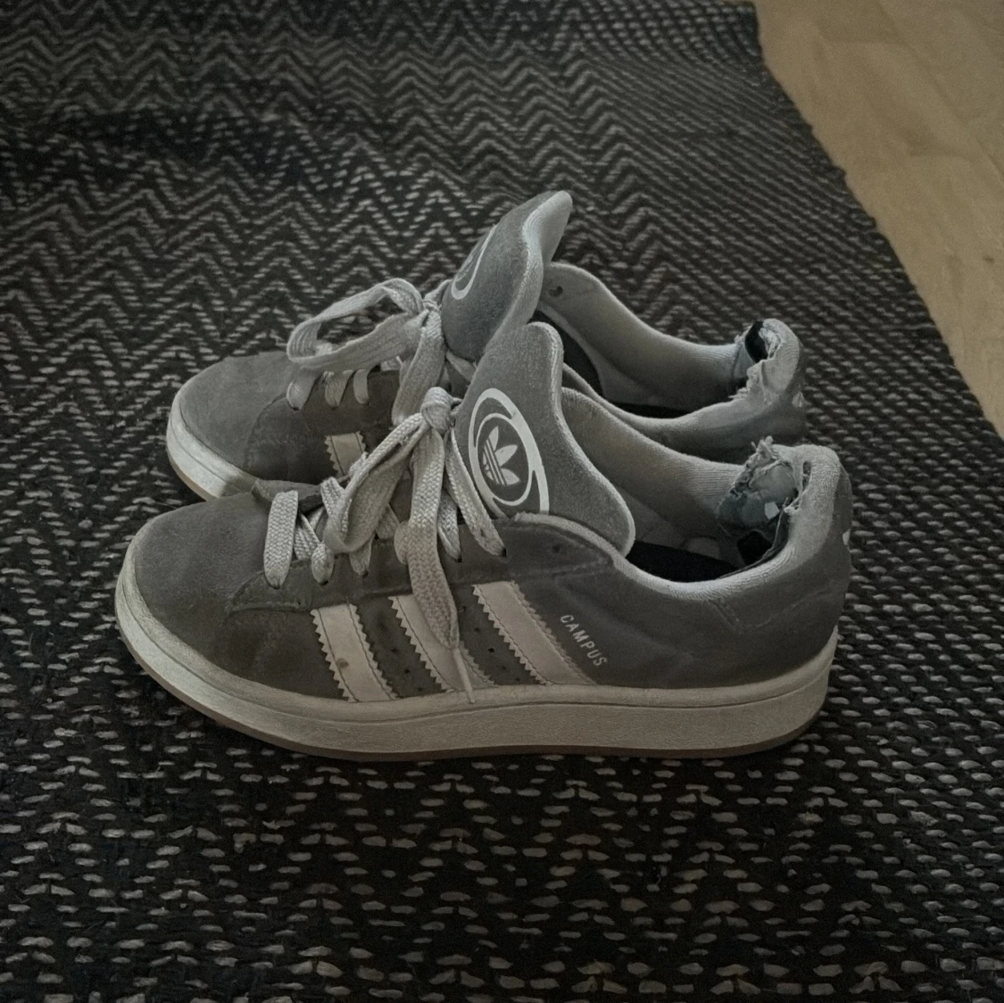 Grå Adidas Campus sneakers. Fina men hål i ovansidan vid hälen. Men det är inget som syns på utsidan. Har satt dit en svart tyg bit för att täcka hålet och de funka bra.