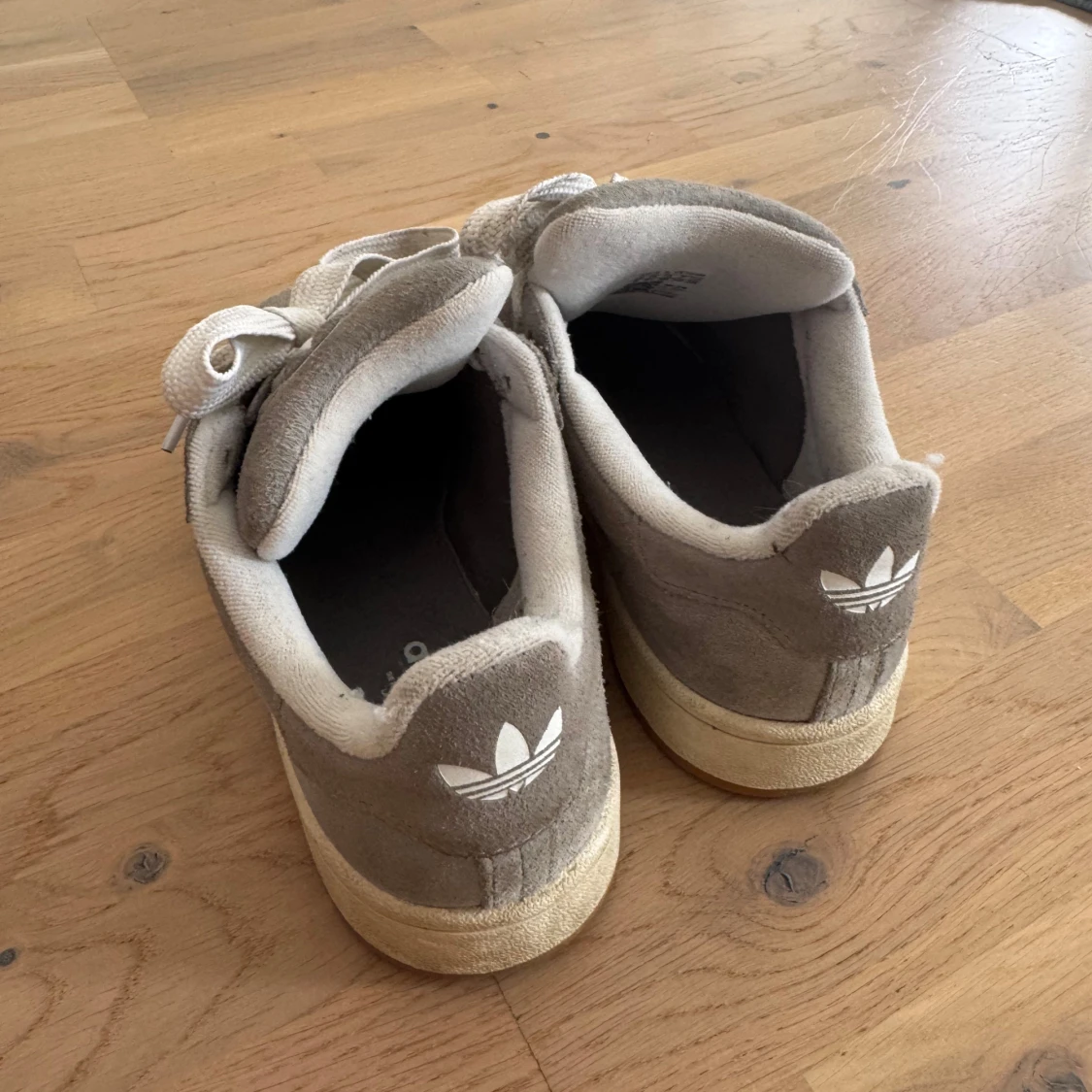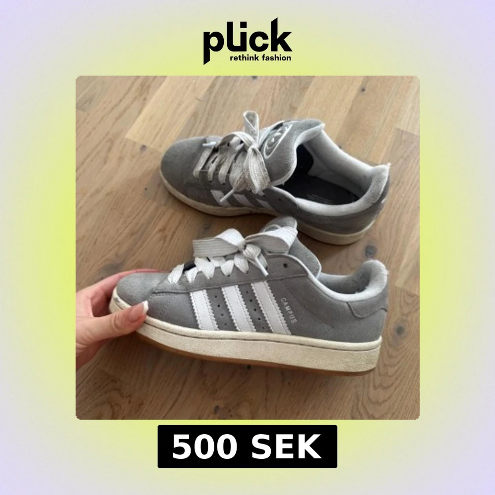 Snygga grå Adidas Campus sneakers med klassiska vita ränder och logga på hälen. Skorna har en låg profil, rund tå och platt sula. Ovandelen är i mjuk mocka och de har vita snören. Perfekta för en avslappnad streetstyle-look.
