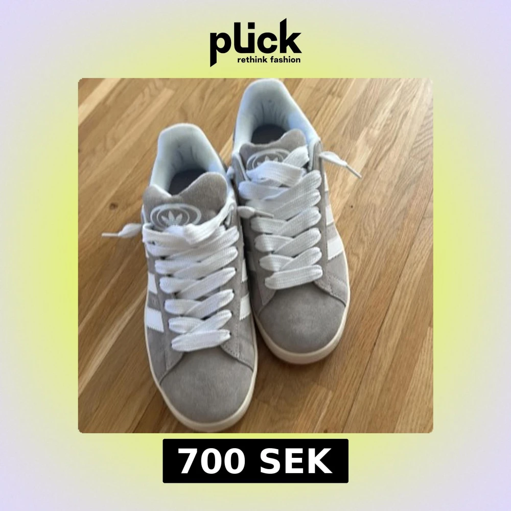 Snygga Adidas Campus sneakers i ljusgrå mocka med klassiska vita ränder och vit sula. Skorna har rund tå, platt sula och breda vita snören. Perfekta för dig som gillar en clean och stilren look med retrovibbar.