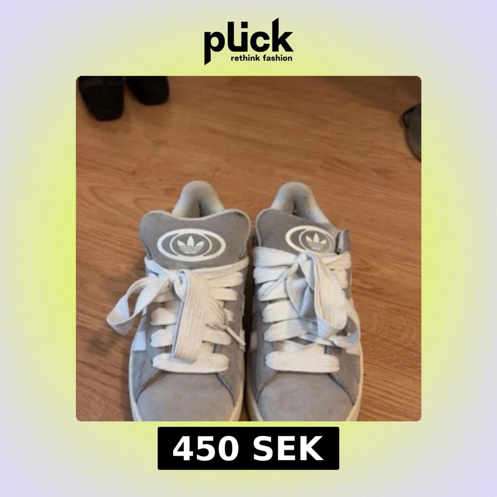 Säljer ett par grå Adidas Campus sneakers i mocka med vita detaljer och klassiska tre ränder på sidan. Skorna har vit sula, rund tå och breda vita snören. Adidas logga syns tydligt på plös och häl. Perfekta för dig som gillar en clean och stilren look.