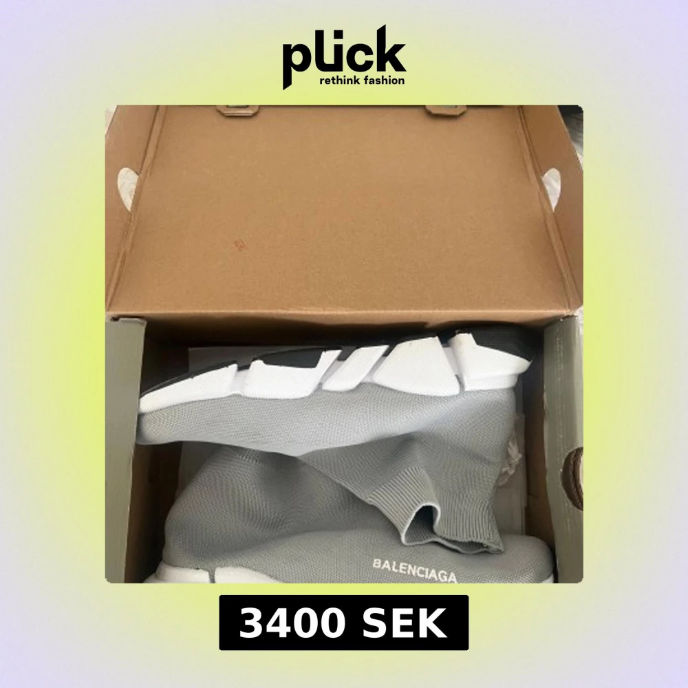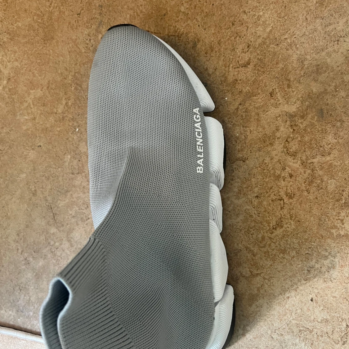 Säljer ett par grå Balenciaga Speed sneakers med vit och svart chunky sula. Skorna har en strumpliknande passform i stickad syntet och Balenciaga-logga på sidan. Perfekta för dig som gillar futuristisk och clean stil. Storlek 43 men stora i storlek
