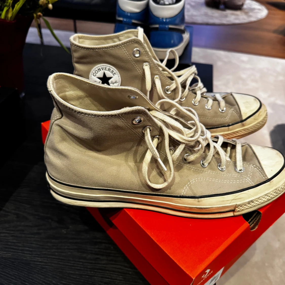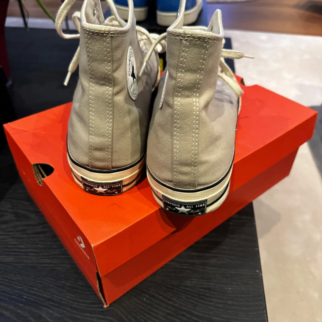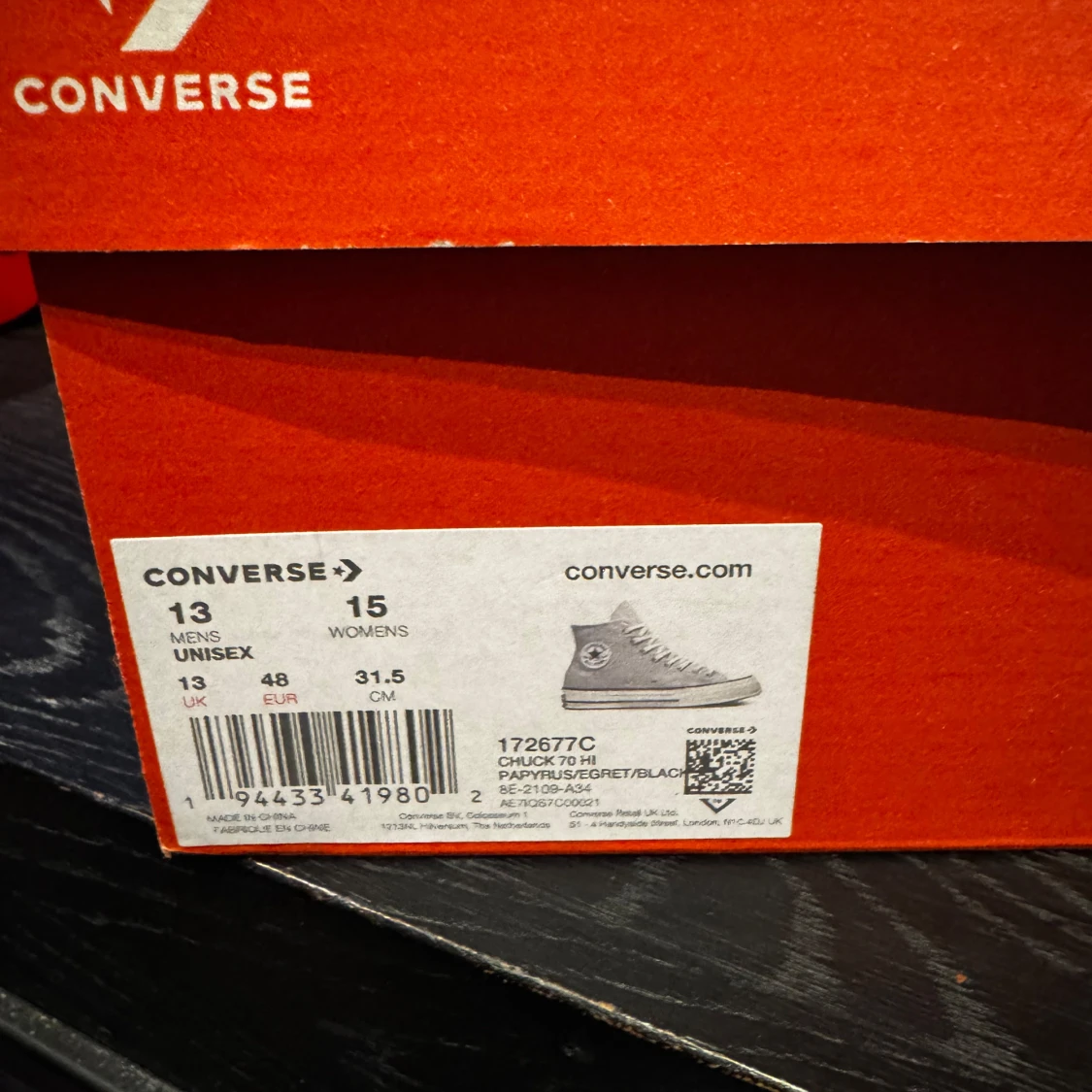 Säljer ett par klassiska grå Converse All Star Chuck Taylor med hög snörning och den ikoniska logotypen på sidan.
