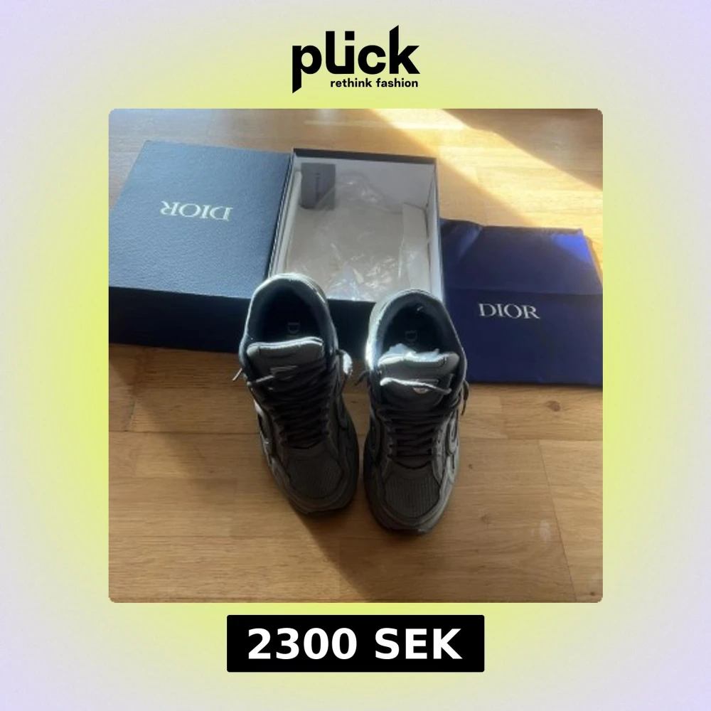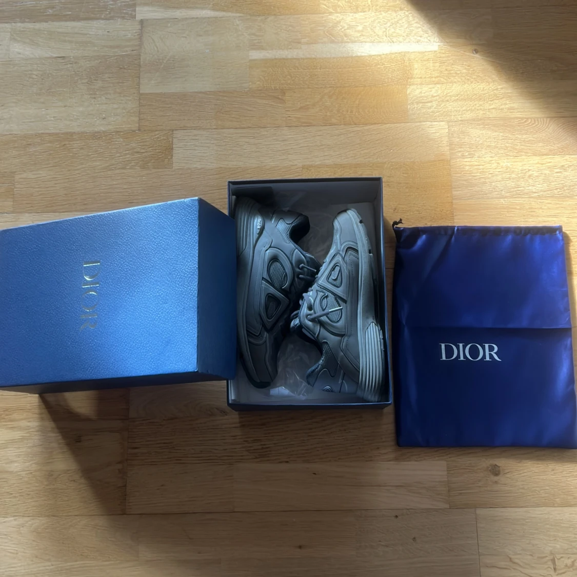 Säljer ett par gråa Dior sneakers med snygga detaljer och klassisk logga på sidan. Skorna har snörning, rund tå och platt sula. Materialmix av skinn och textil ger en exklusiv känsla. Kommer med originalkartong och dustbag.
