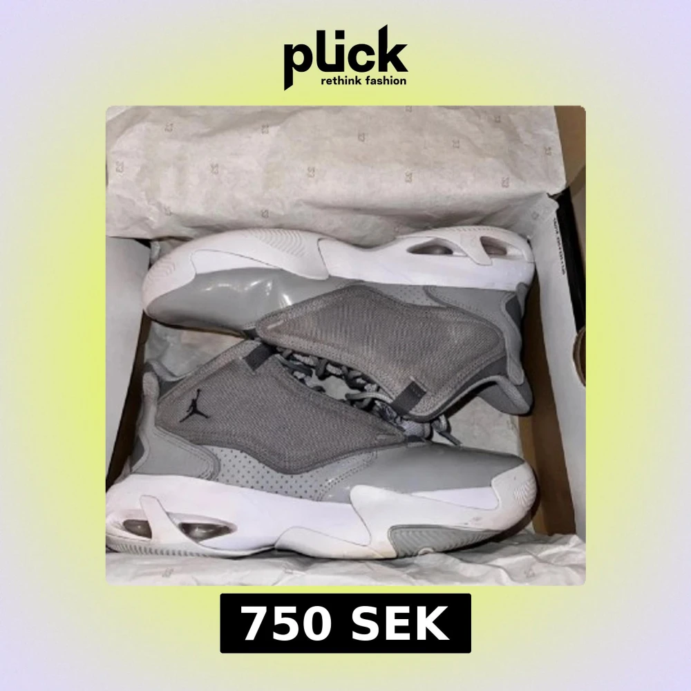 Snygga grå Jordan Max Aura 4 sneakers med vit sula och ikonisk Jumpman-logga. Skorna har en modern design med snörning och är perfekta för en sportig look.