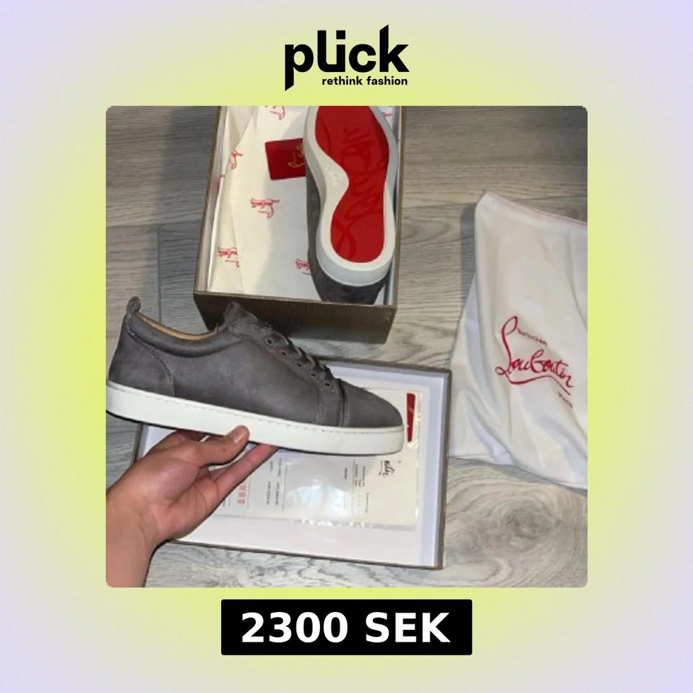 Snygga grå sneakers från Christian Louboutin i mjuk mocka med klassisk vit platt sula och ikonisk röd undersida. Skorna har rund tå, snörning och diskreta sömmar som ger en clean look. Perfekta för dig som gillar exklusiva detaljer och stilren design.