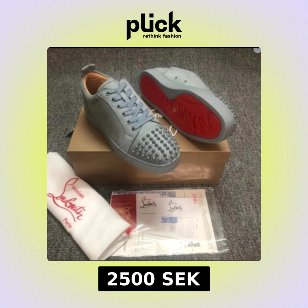 Snygga grå sneakers från Louboutin med ikonisk röd sula och coola nitar över tån. Skorna har snörning och är gjorda i mocka för en lyxig känsla. Perfekta för dig som vill sticka ut med en edgy och exklusiv stil.