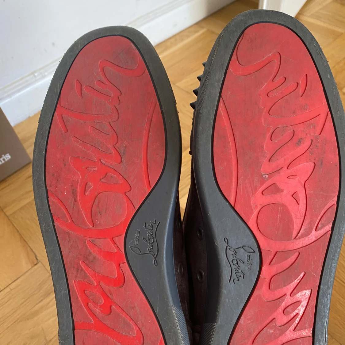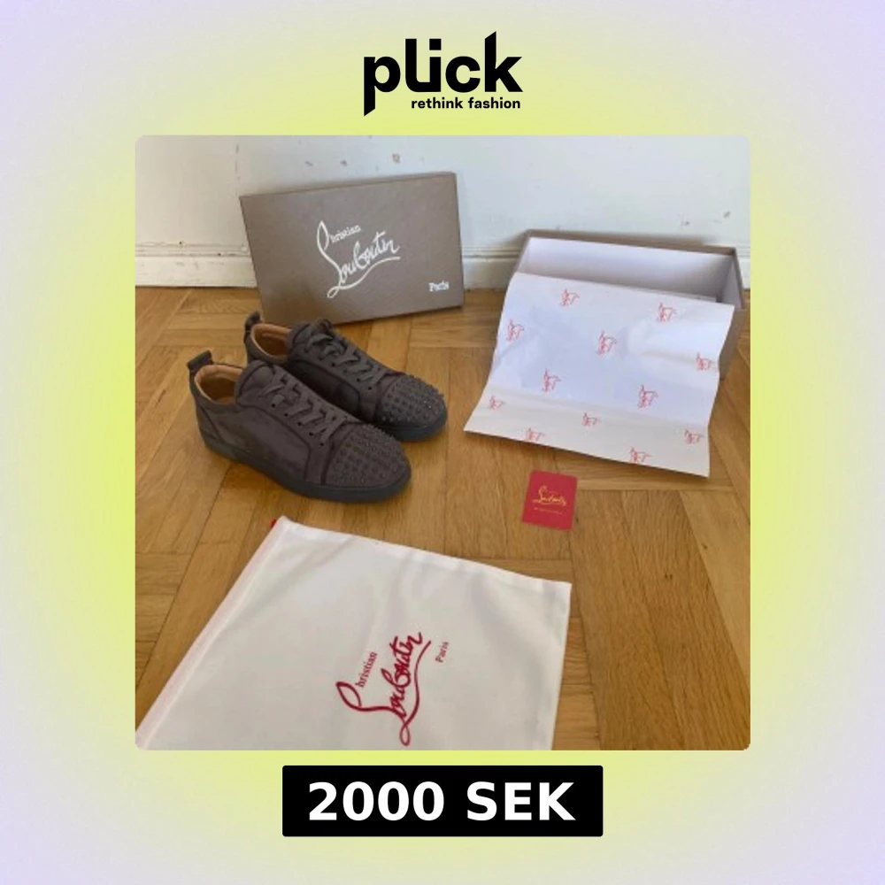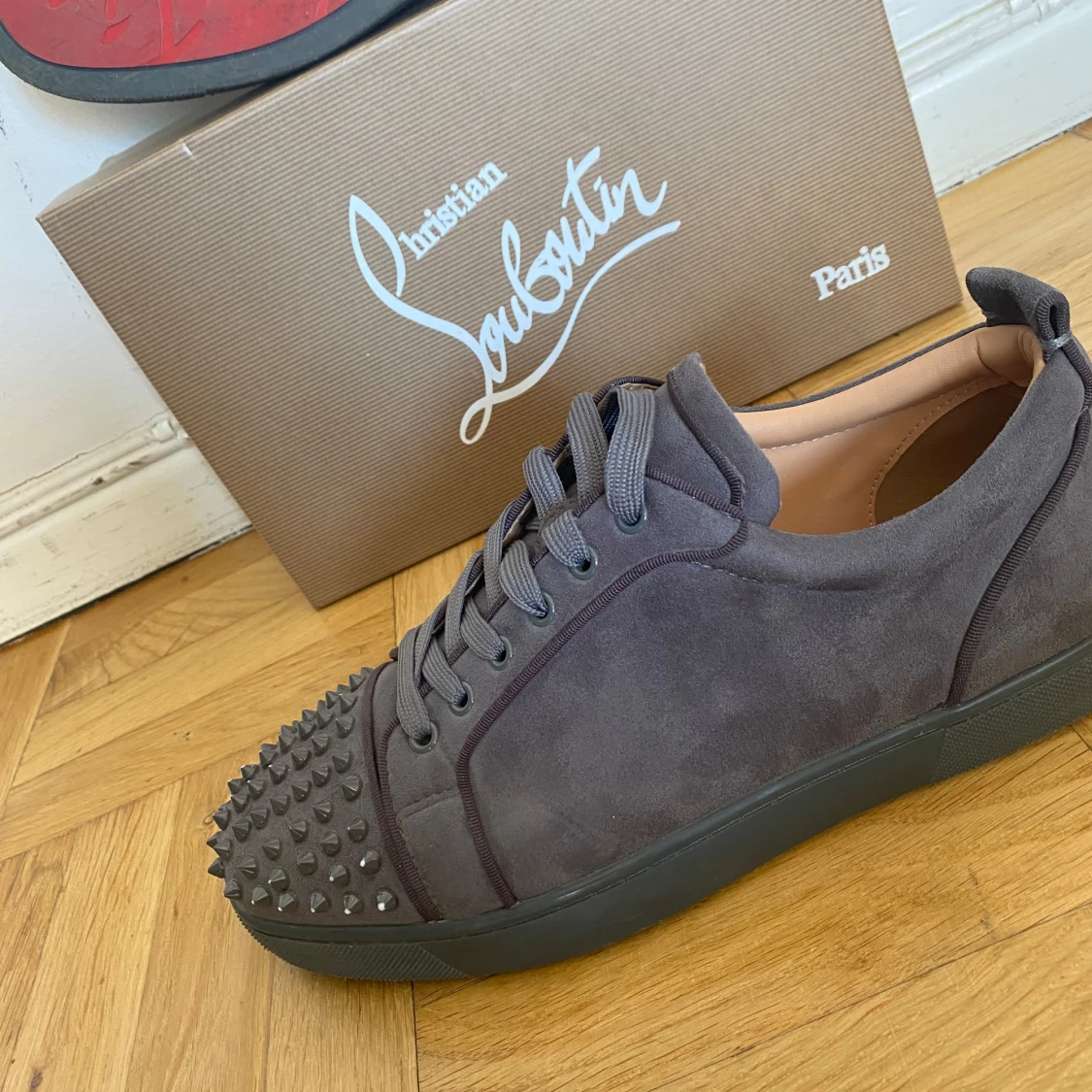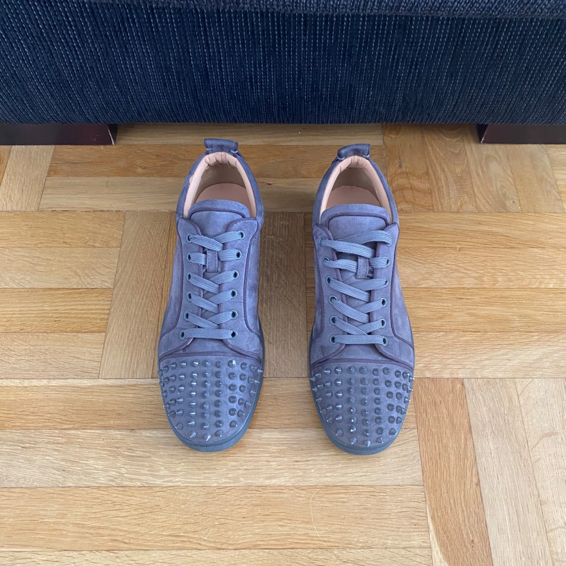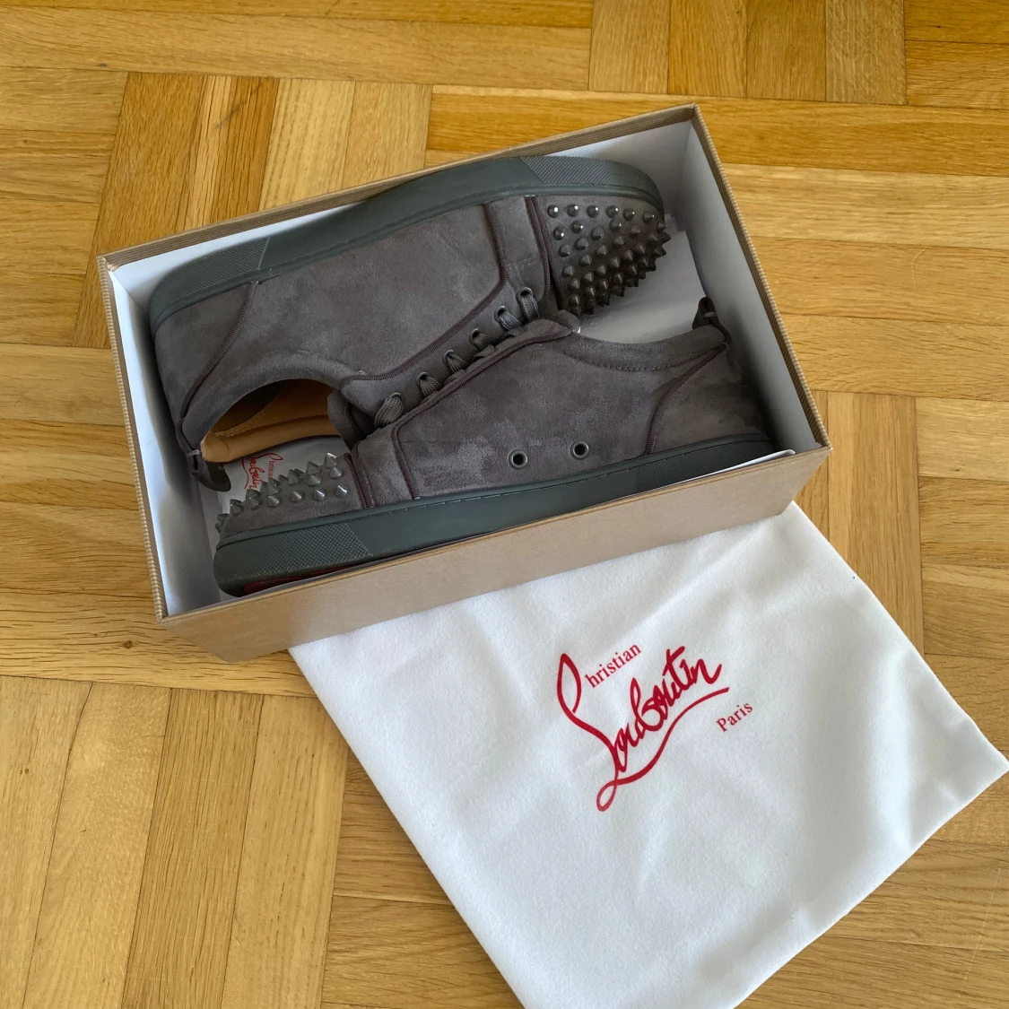 Snygga grå sneakers i mocka från Christian Louboutin med ikoniska röda sulor och coola nitar på tån. Skorna har snörning och en rund tå, perfekt för dig som vill sticka ut med exklusiv streetstyle. Kommer med originalkartong och dustbag.