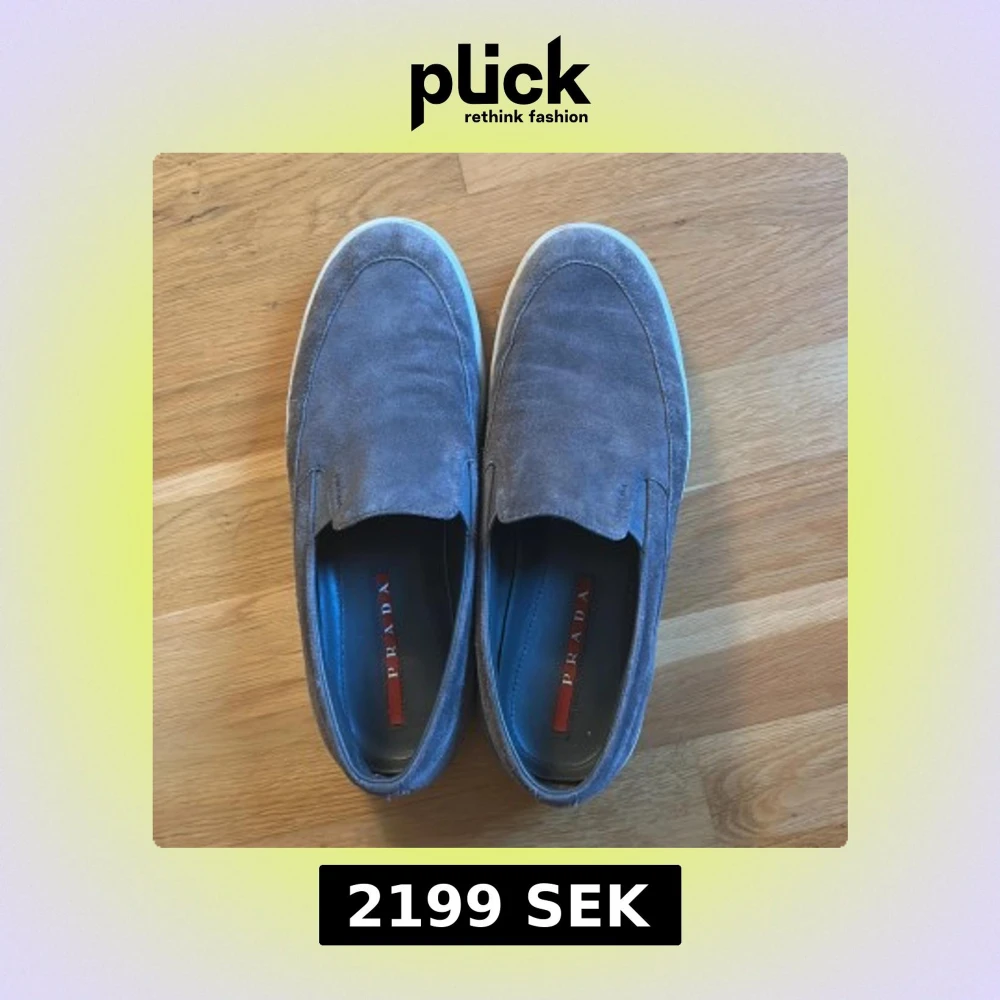 Säljer ett par stilrena grå loafers från Prada i mjuk mocka med vit platt sula. Skorna har diskret Prada-logga på sidan och röd detalj på innersulan. Perfekta för dig som gillar klassisk och clean stil!