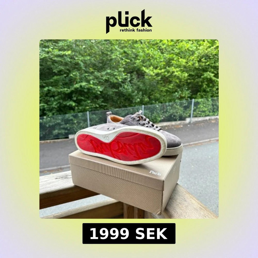 Säljer ett par grå sneakers från Christian Louboutin i mjuk mocka med klassisk röd sula och snygg snörning. Skorna har rund tå, vit platt sula och beige innersida med guldfärgad logga. Perfekta för dig som gillar stilrena och lyxiga detaljer. Storlek 45. Köpte, säljer nu för att de är för små! Knappt använda