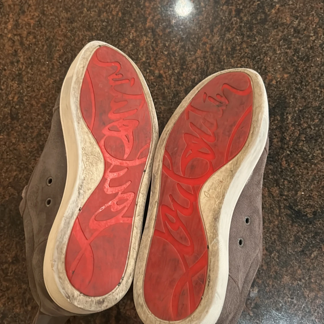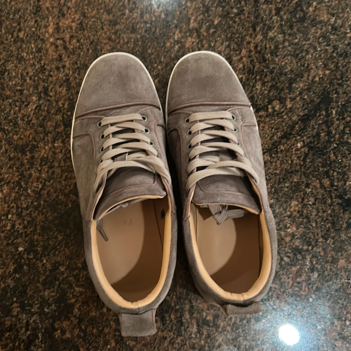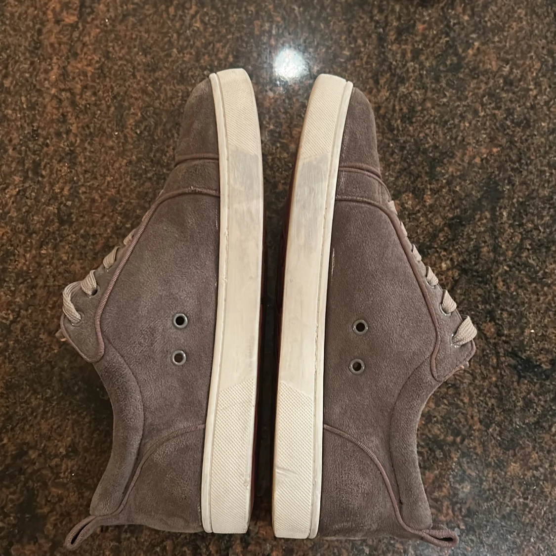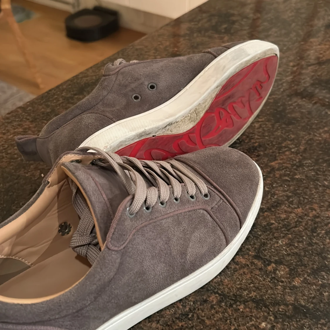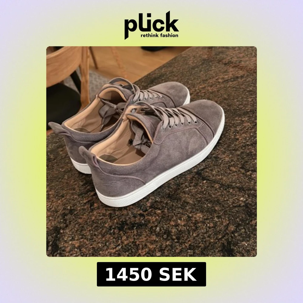 Snygga grå sneakers i mocka med vit platt sula och rund tå. Skorna har snörning i matchande grå färg och en röd detalj på undersidan av sulan. Insidan är ljusbeige och de har en stilren, minimalistisk design som passar till många olika outfits.