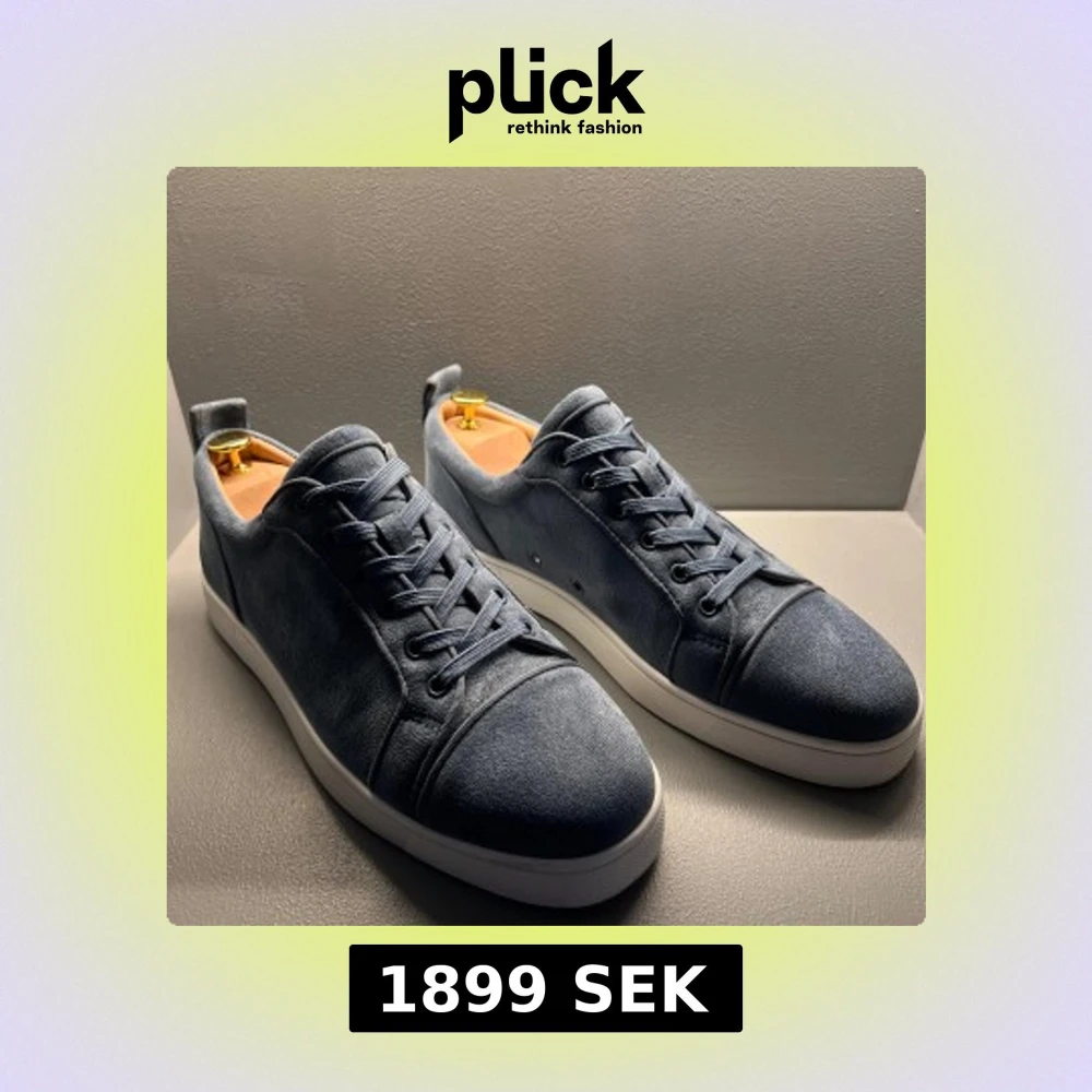 Säljer ett par stilrena blåa sneakers i mocka från Christian Louboutin med klassisk röd sula. Skorna har rund tå, snörning och vit platt sula. Perfekta för dig som vill ha en lyxig och clean look.