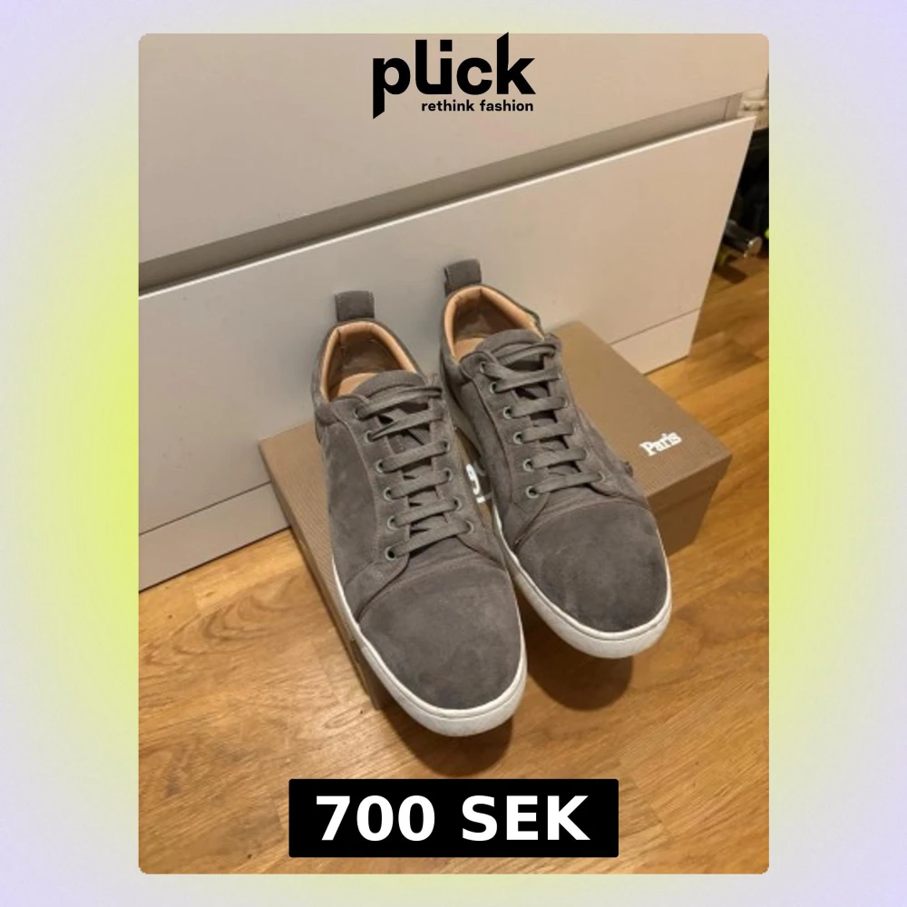 Snygga grå sneakers i mocka från Christian Louboutin med klassisk röd sula och vita kanter. Skador på skorna det är därför priset är sänkt.